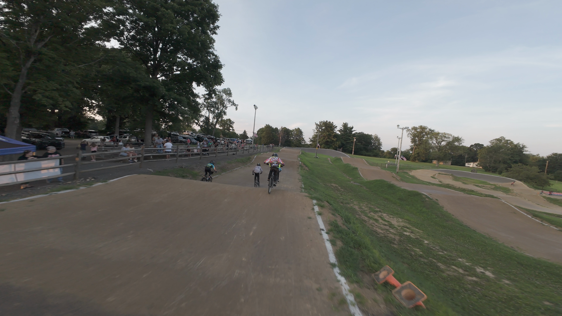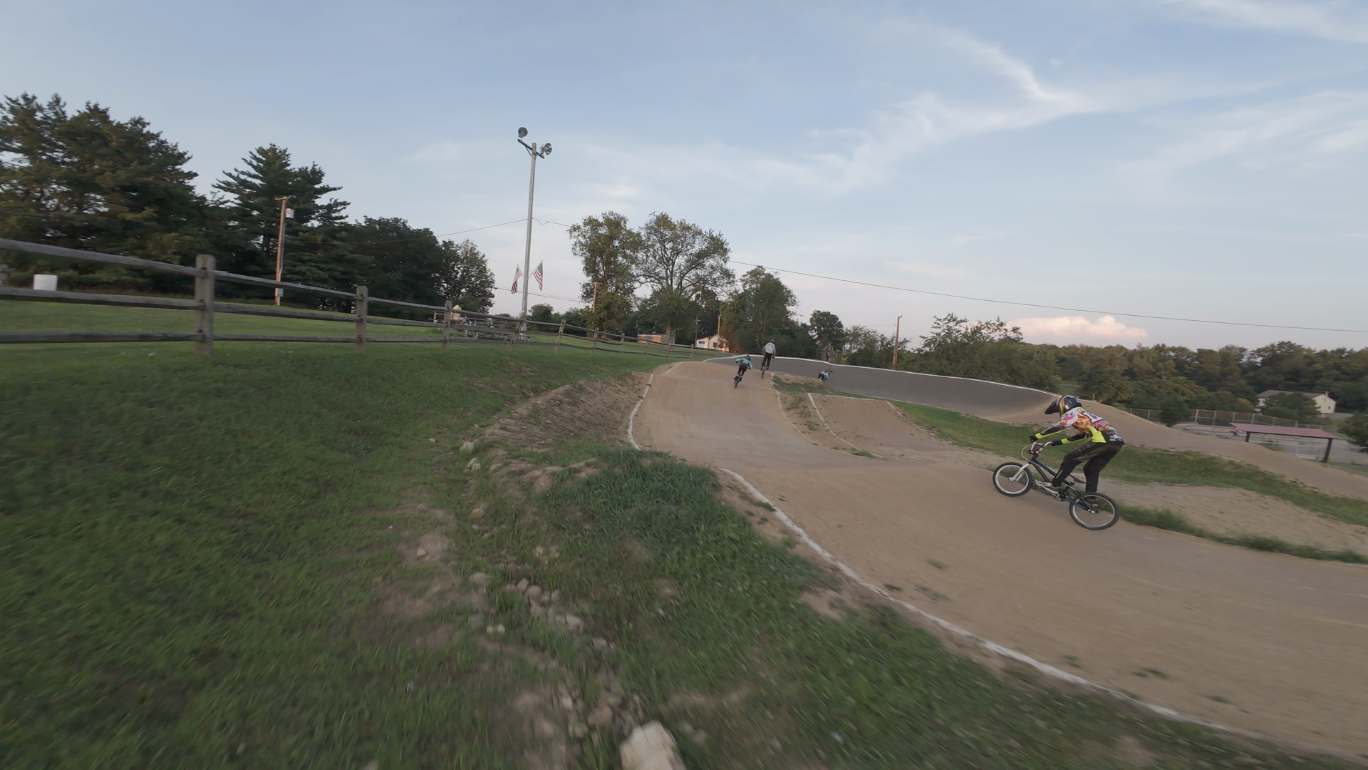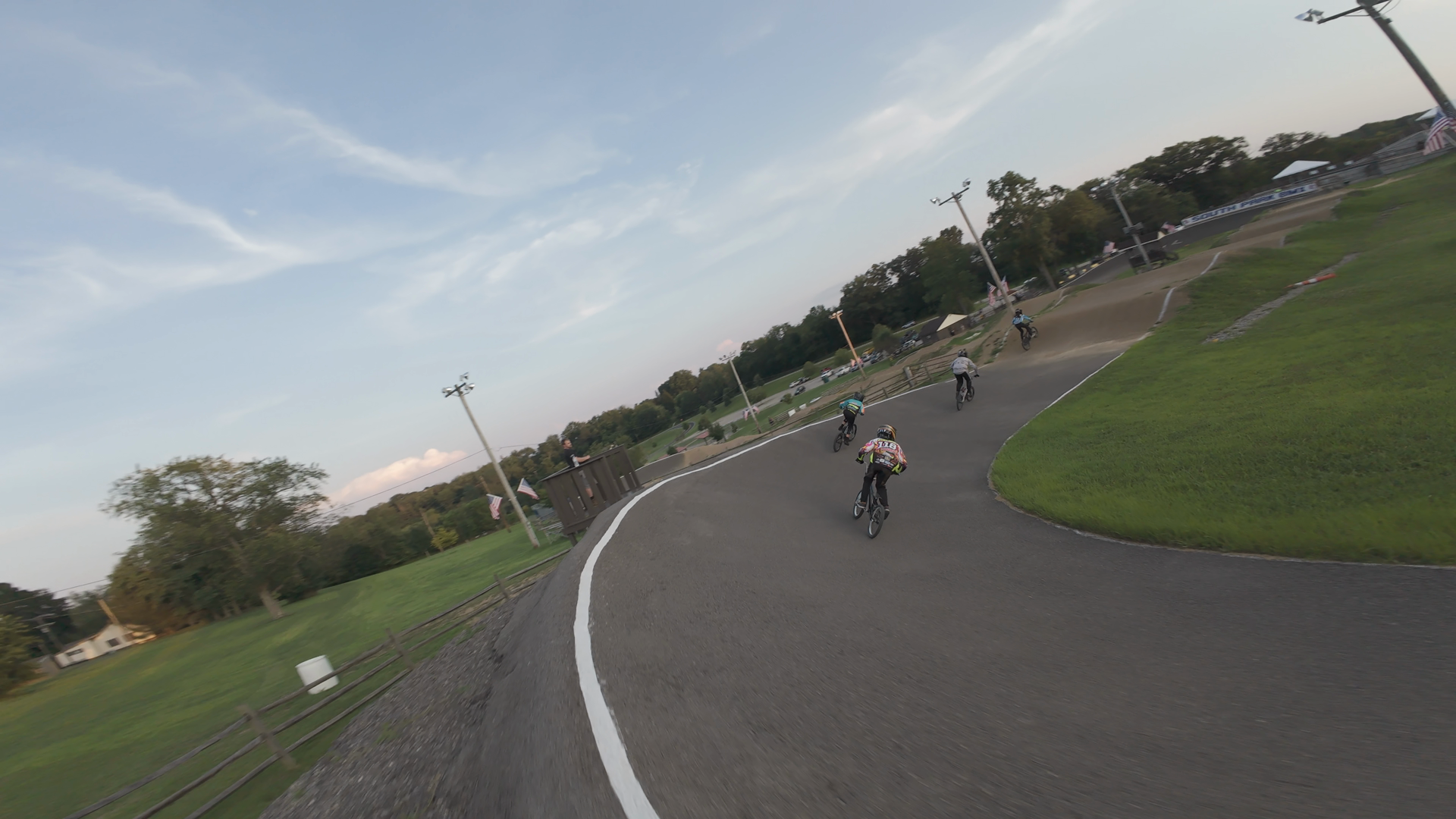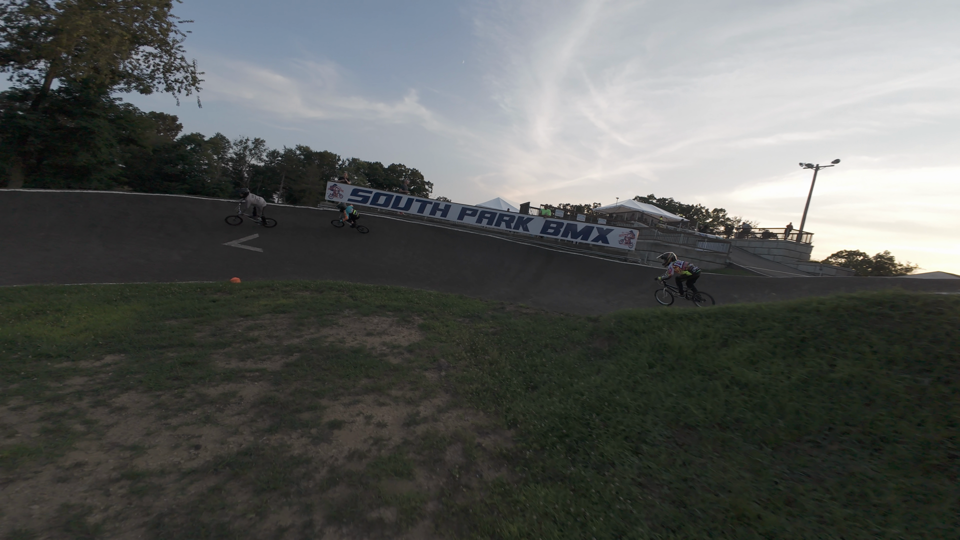 A group of BMX riders in action on a track curve at South Park BMX during the evening. The riders, viewed from behind, are navigating a sharp curve on a concrete track bordered by grass and trees. The riders are wearing helmets and jerseys, with one prominently displaying the number 10. The setting sun casts a soft glow over the scene, and a few structures are visible in the background, indicating a community setting.