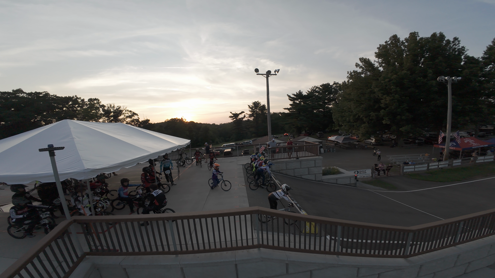 A group of young BMX racers line up at the starting line at South Park BMX, waiting for the race to begin. The starting area is set up with a concrete starting platform, surrounded by a safety railing. The environment shows a clear evening sky transitioning into sunset, with trees and a few tents visible in the background. The racers are wearing colorful helmets and casual racing attire, ready for the big race.
