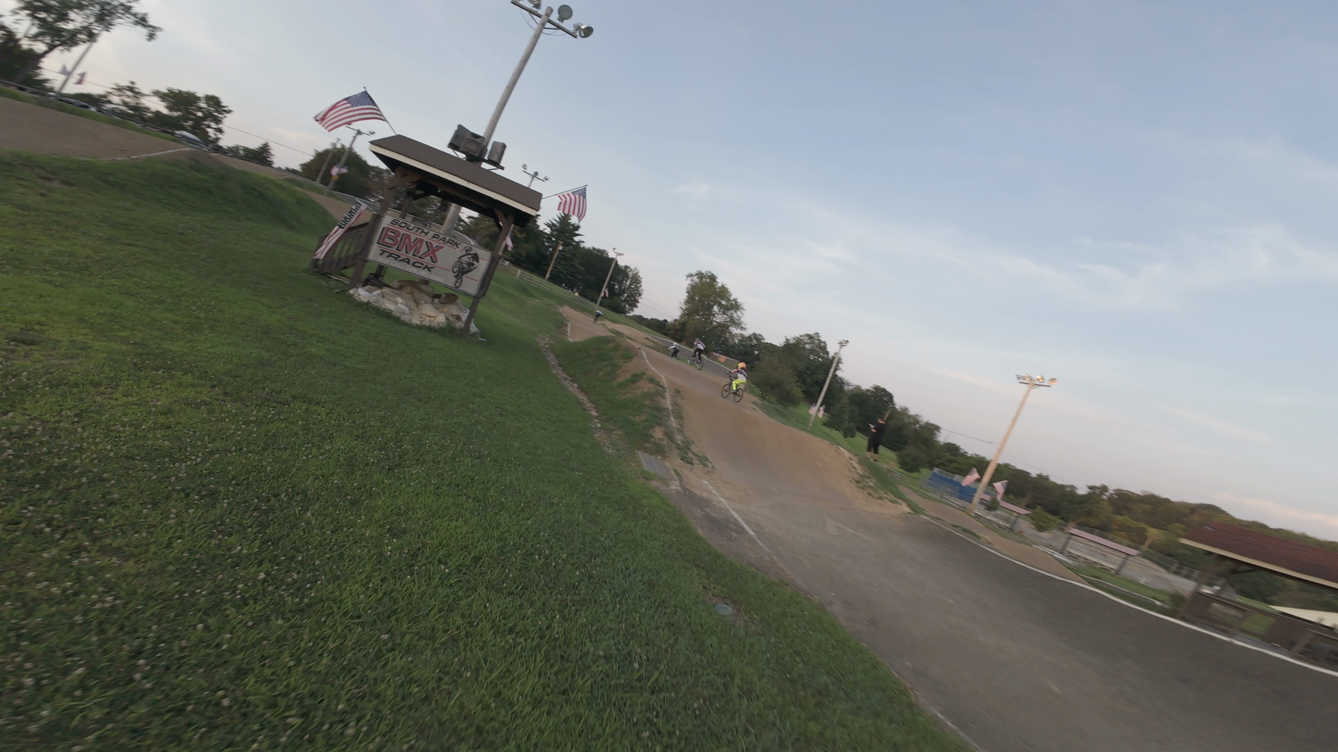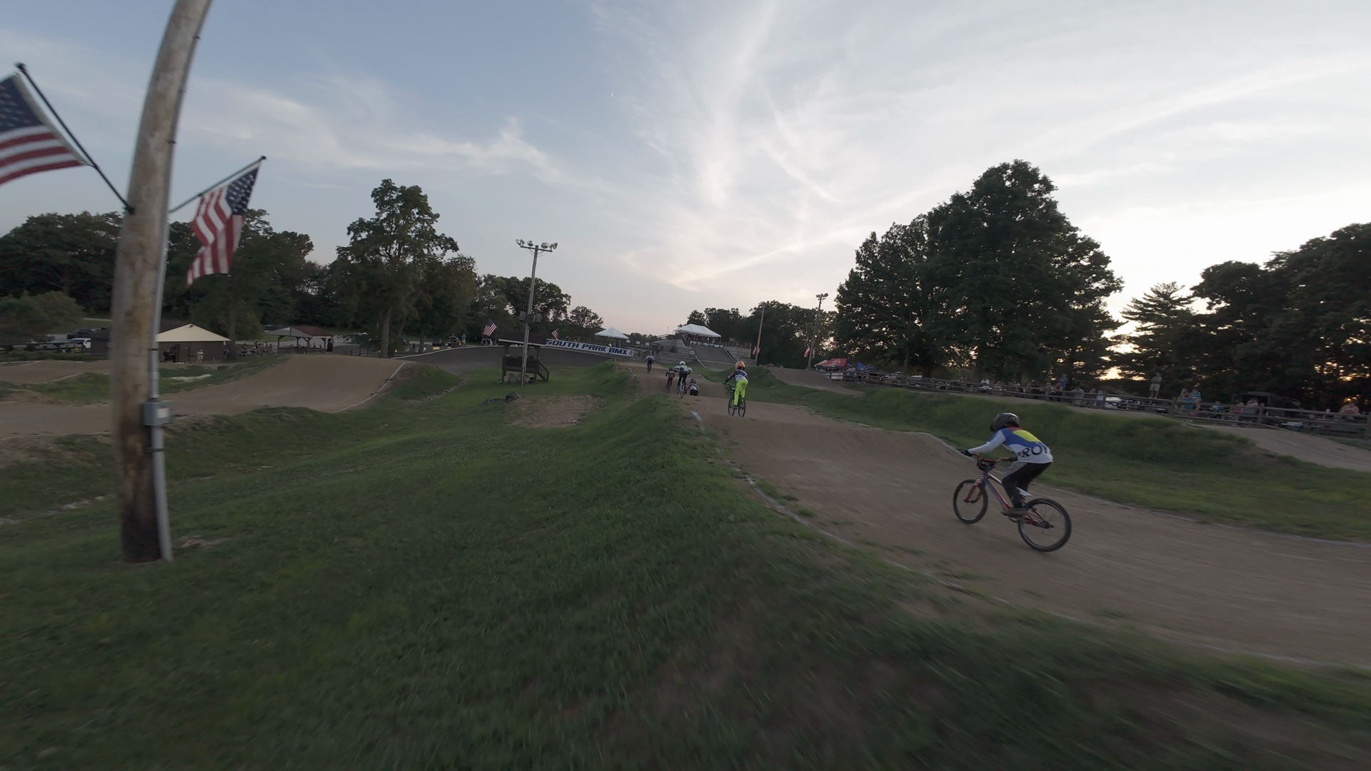 BMX riders are seen navigating the slopes at South Park BMX, a track known for its challenging terrains and historic significance. The riders are in motion, with some appearing to be in the lead while others follow. The track features grassy hills and a well-maintained asphalt section, typical of BMX racing venues. American flags are visible, fluttering in the breeze, adding to the patriotic ambiance of the location.