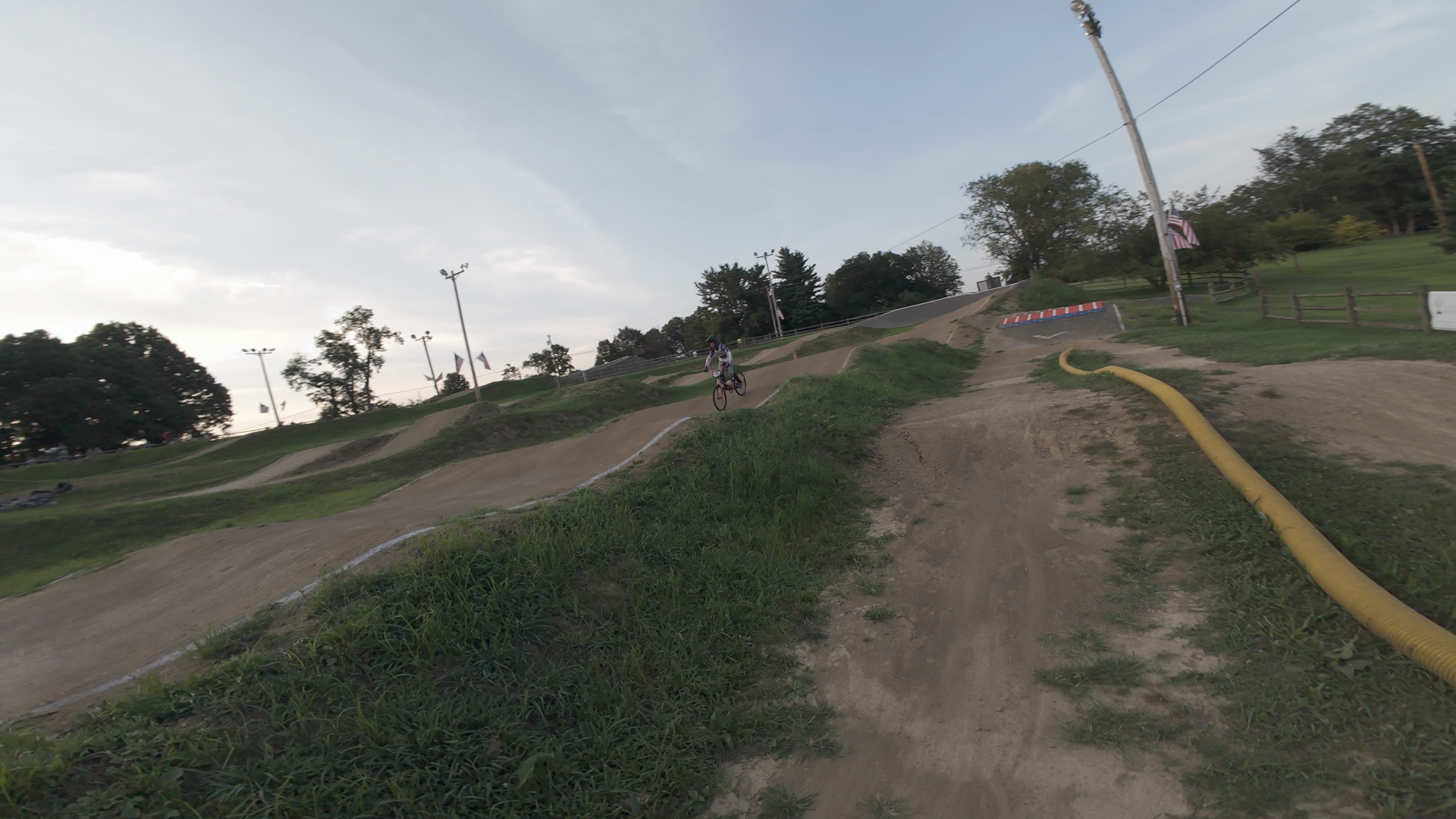 • BMX riders racing on a track at dusk.