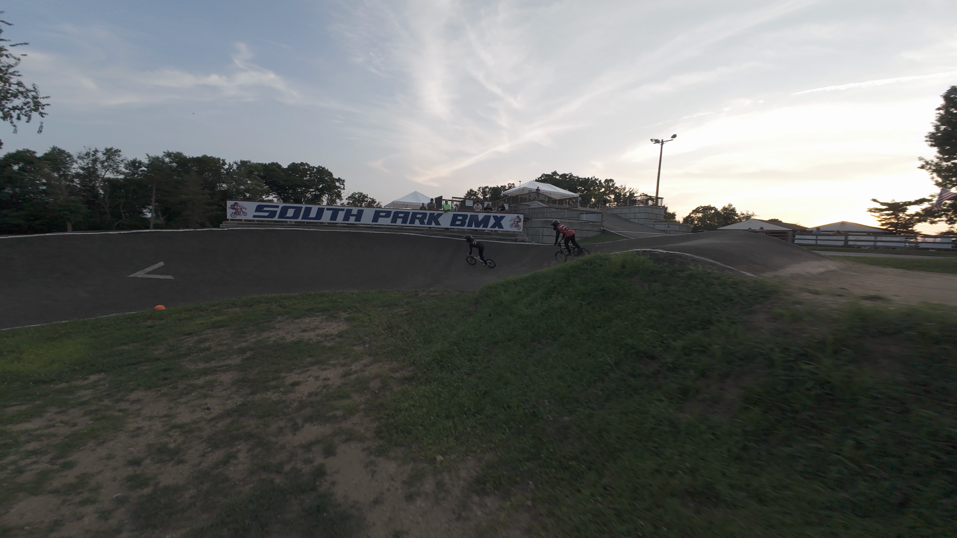 A wide, long shot captures the South Park BMX track setting during sunset, where two BMX riders are racing, one just ahead of the other. The track is surrounded by grass and trees, with the track surface appearing brown and dusty. The racers are on their bikes, leaning forward in a competitive position as they navigate the downhill section. A large banner reading “SOUTH PARK BMX” hangs in the background, and several spectators can be seen watching the event from the terraces and stands near the track, creating a lively atmosphere.
