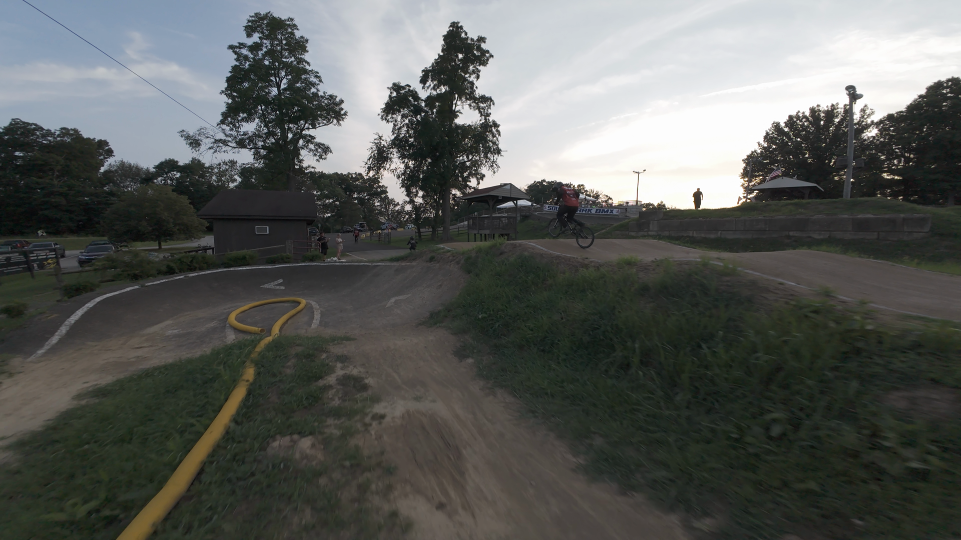 • Rider on a dirt track at South Park BMX, at dusk.