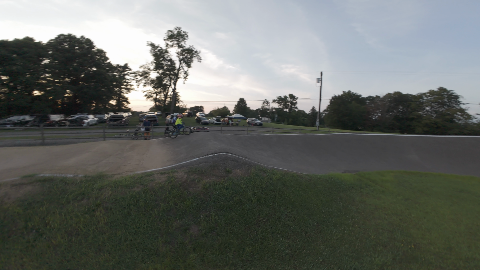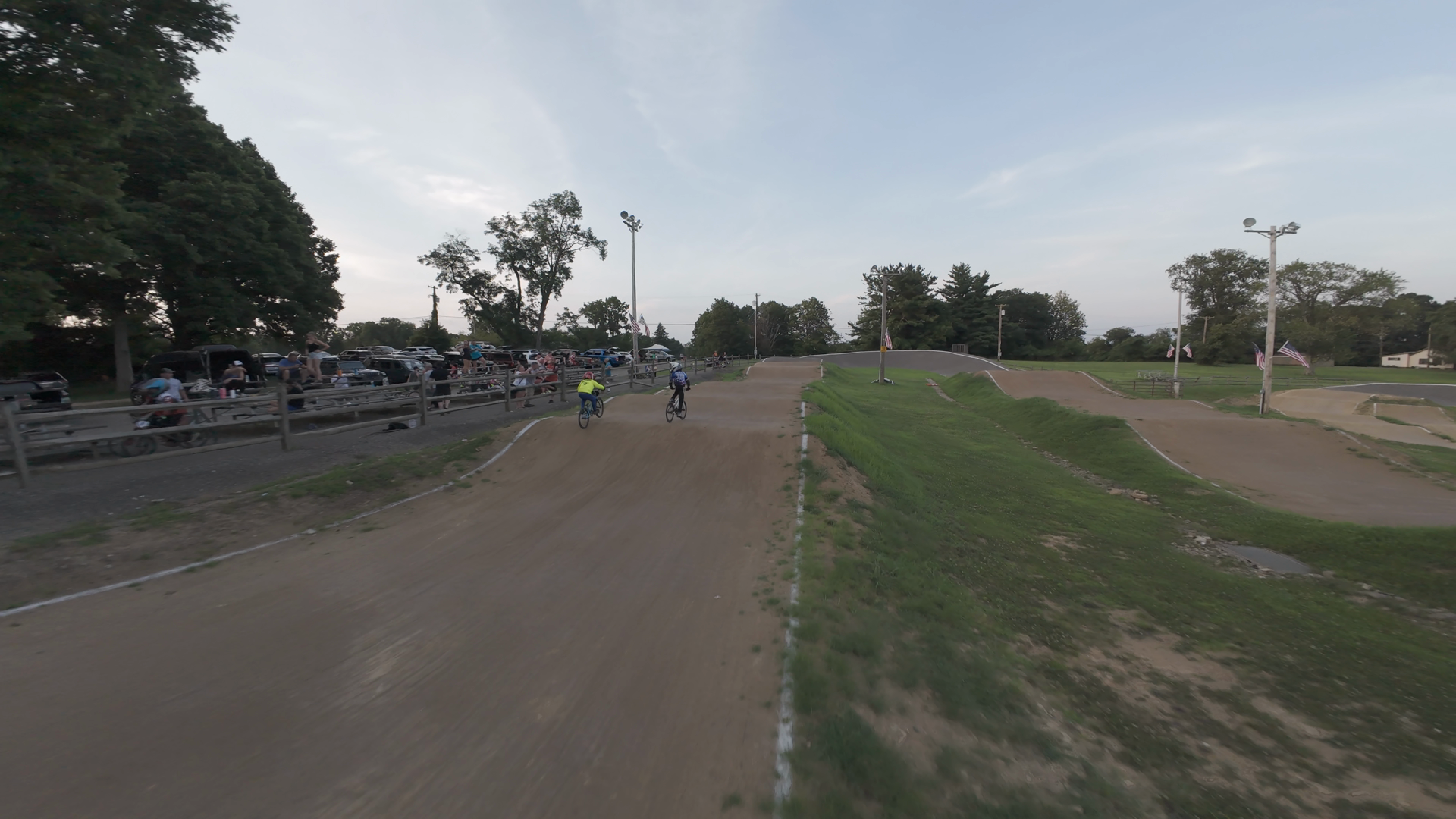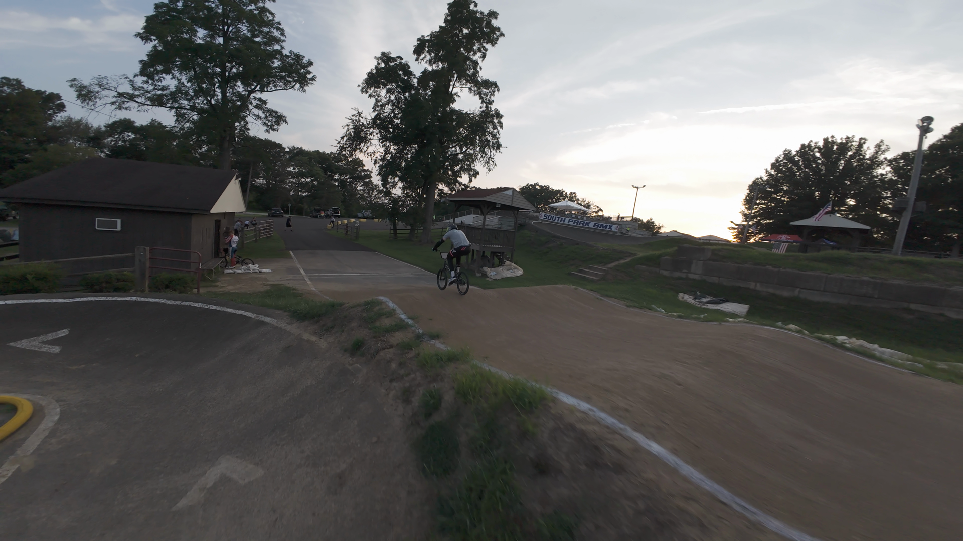 The video shows a wide view of the South Park BMX track with riders preparing to race. The track features a large banked bank with riders seen on bicycles near the edge. There are several parked cars and spectators in the background, and the overall scene is set under a clear sky with trees lining the edges of the track.