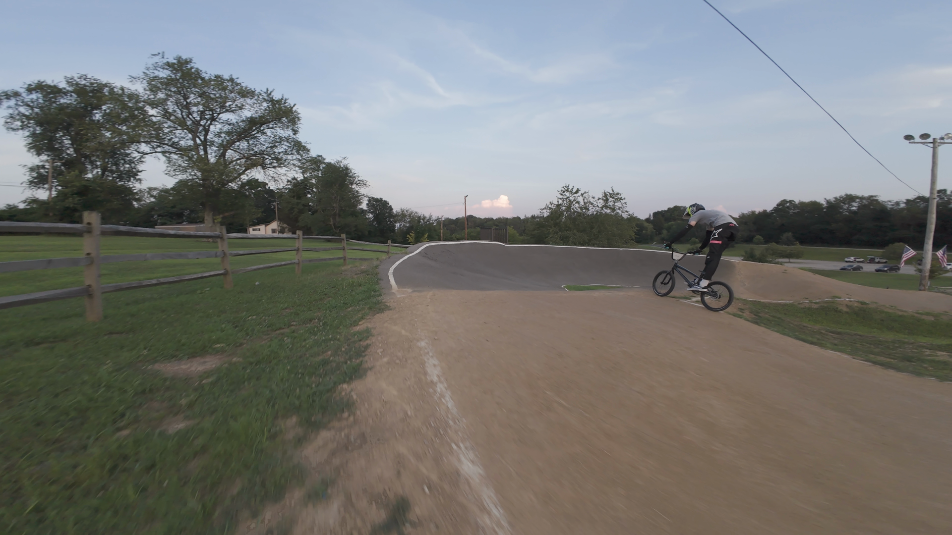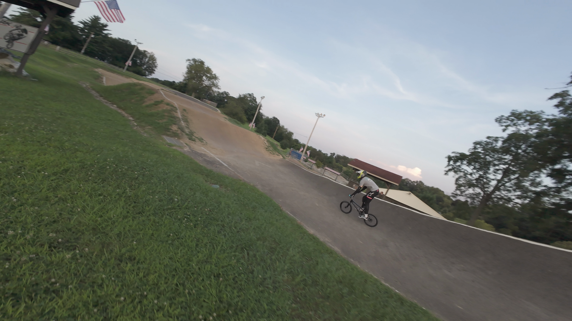 A BMX rider in a gray and yellow helmet and dark clothing is mid-turn on a bend in the South Park BMX track, maneuvering a black bicycle. The rider appears to be focused, leaning into the curve as they race at a high-speed. The surroundings include a grassy area and some scattered trees under a clear sky.