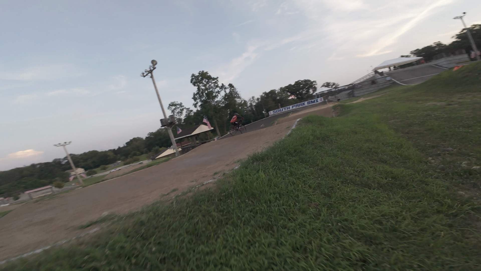 A solo rider in a red and black racing suit is seen riding a BMX bike along the curve of the dirt track at South Park BMX. The rider is positioned mid-bend, leaning into the curve with the bike's frame visible and appearing to be in motion. The scene takes place under a clear sky during the evening, with minimal visibility of spectators or other competitors. The track and surrounding area are marked with greenery and a small tent is visible in the background.