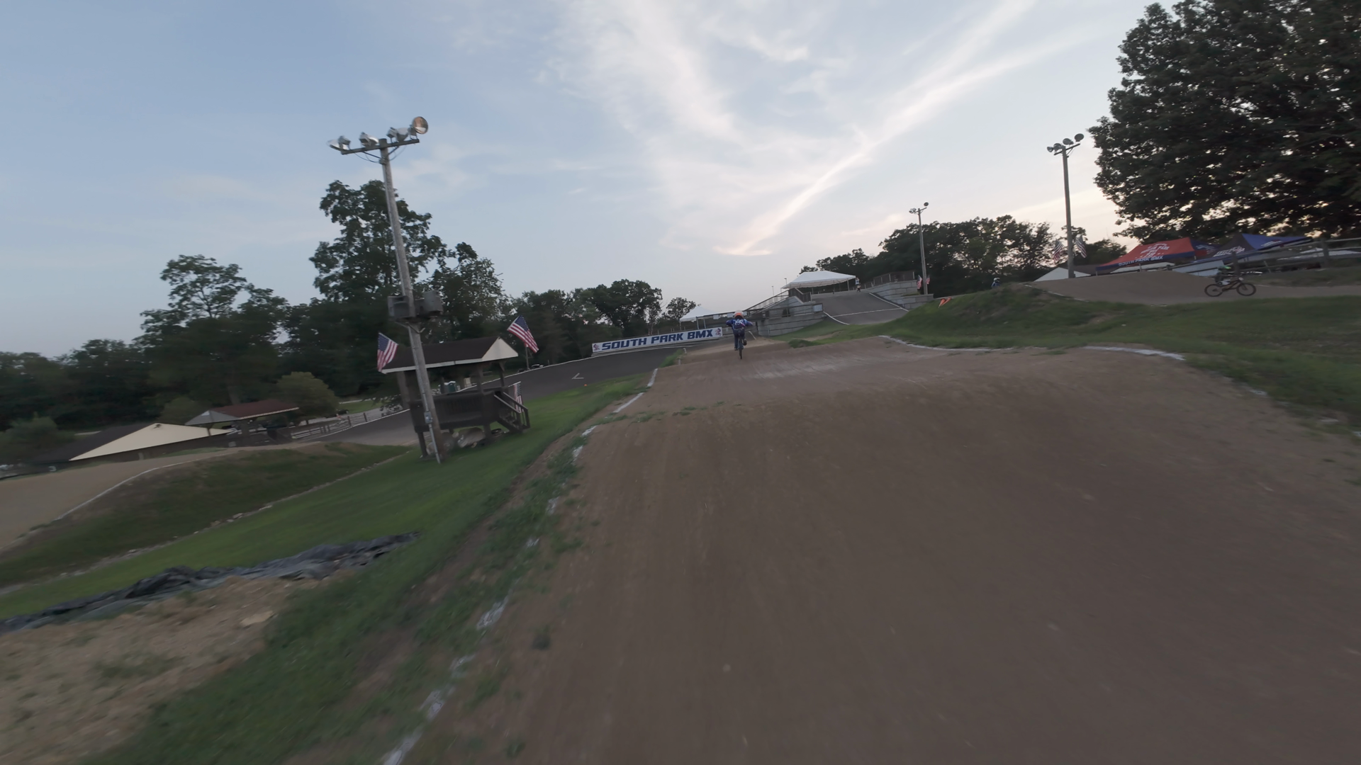 A lone rider is seen riding on the challenging dirt track at South Park BMX. The rider is far away in the distance, and appears to be at the end of the track, with only the American flag and a sign that reads 'SOUTH PARK BMX' visible in the background. The scene is calm and quiet with no other riders in sight, and the track is surrounded by greenery and a few structures.