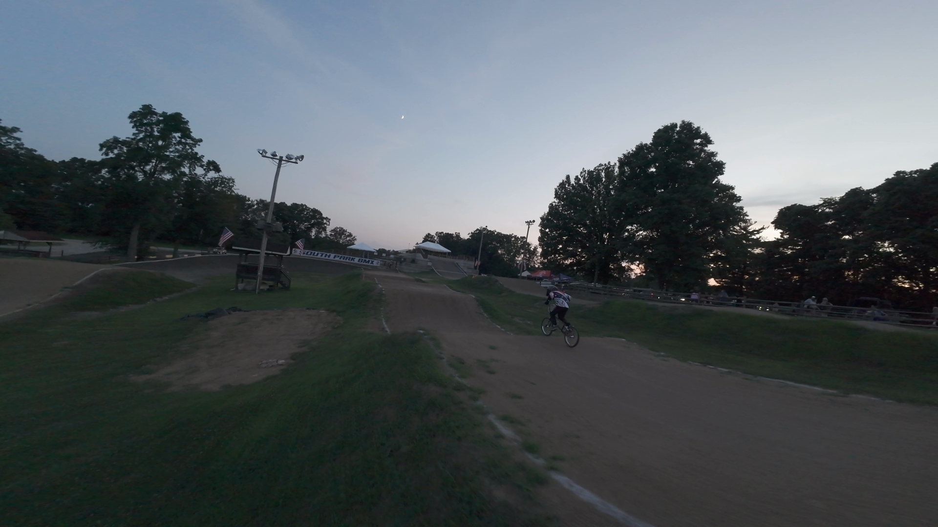 The scene captures a lone Rider at South Park BMX during a quiet moment at dusk. The track is illuminated by artificial lighting, highlighting the sand jumps and curves of the track. The surrounding area features grassy terrain and a few trees in the background. A vehicle is visible in the distance near the track, possibly for event management or maintenance. The soft glow of the dusk sky adds a serene ambiance to the setting, with a slightly visible setting or crescent moon in the sky above the horizon.