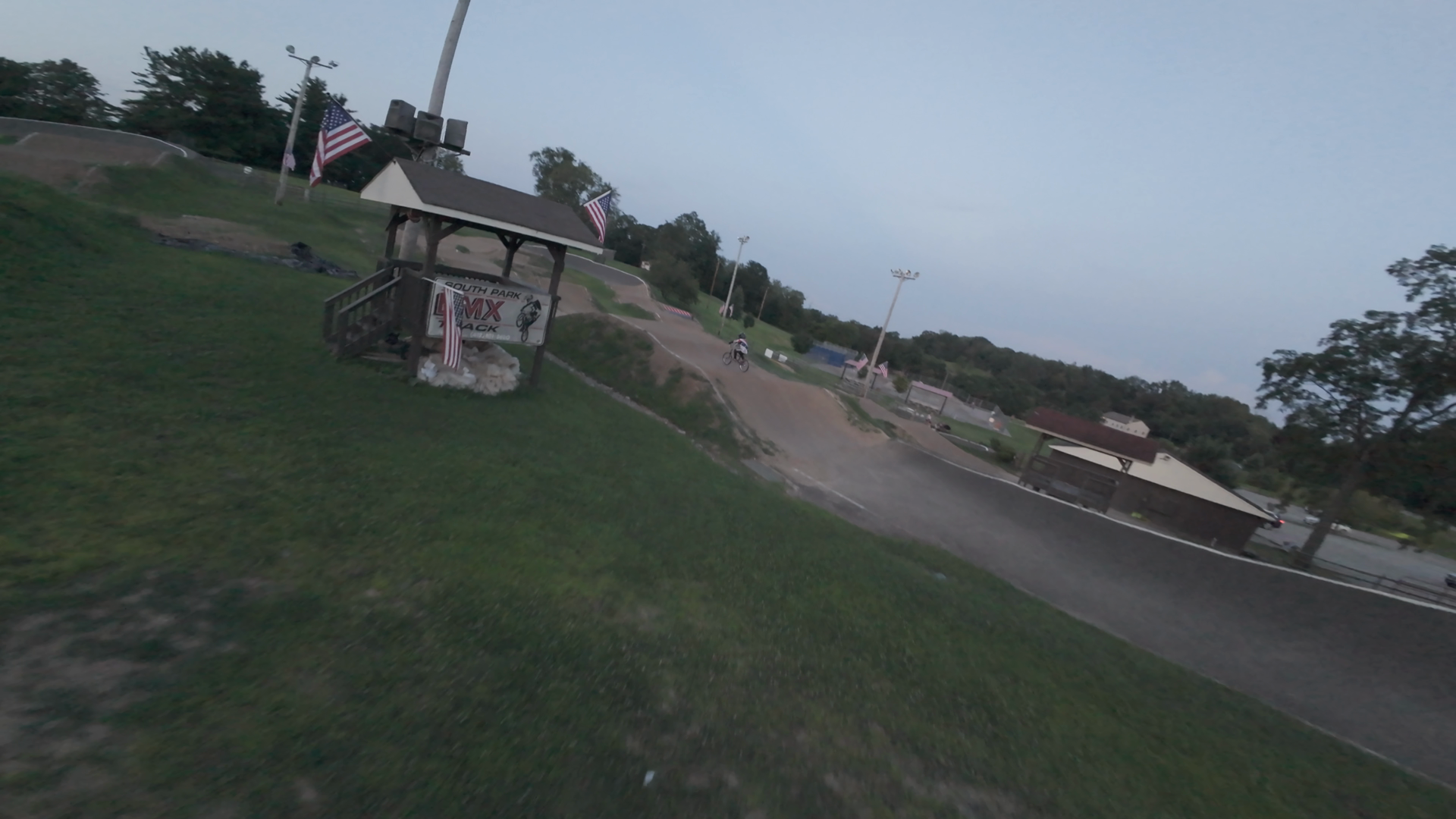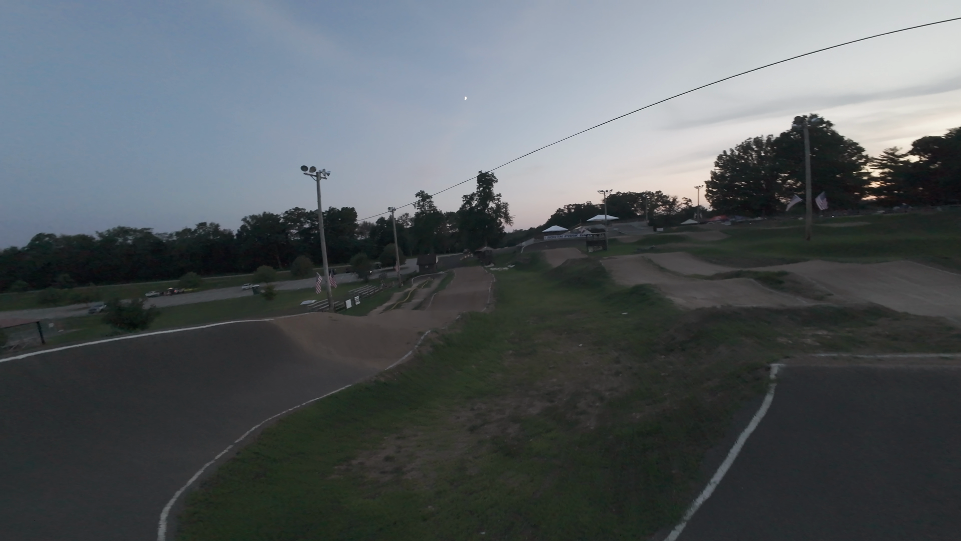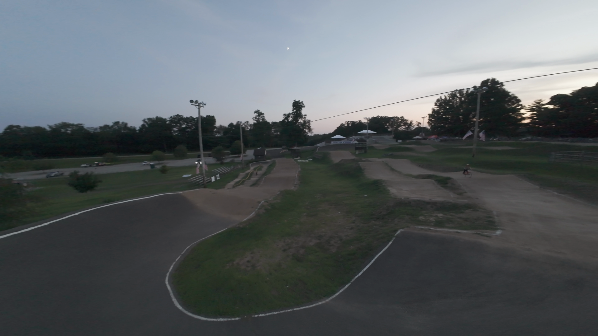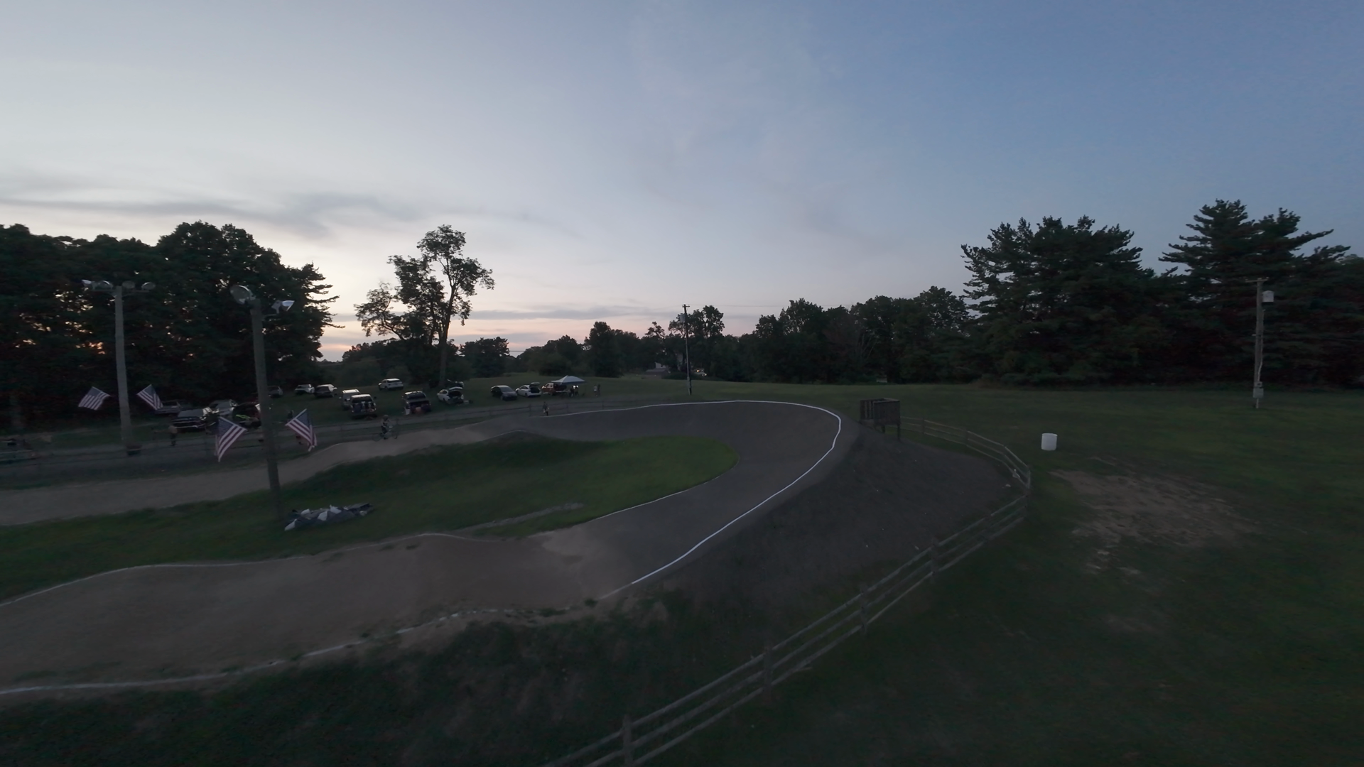 The South Park BMX track is captured in an aerial view during dusk, showcasing its curved dirt path and lush green surroundings. The track is bordered by wooden fences and scattered with American flags. Vehicles are parked in the background near the perimeter, with a few spectators gathered near the track's entrance.