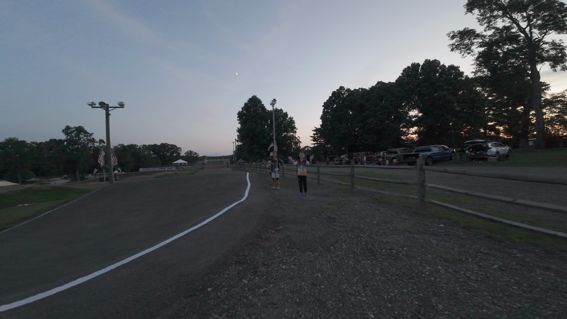 At dusk, two individuals are seen waving from the sidelines of a BMX track at South Park BMX. The setting is a rural area, with trees in the background and a clear view of the track stretching into the distance. The scene is illuminated by soft, ambient light, suggesting the early evening. The individuals are casually dressed, and the atmosphere appears calm and friendly, indicating a break or a pause in the event. There are parked vehicles and some equipment visible in the background, adding to the context of the event location. The excitement level is relatively low, suggesting a lull phase in the event.
