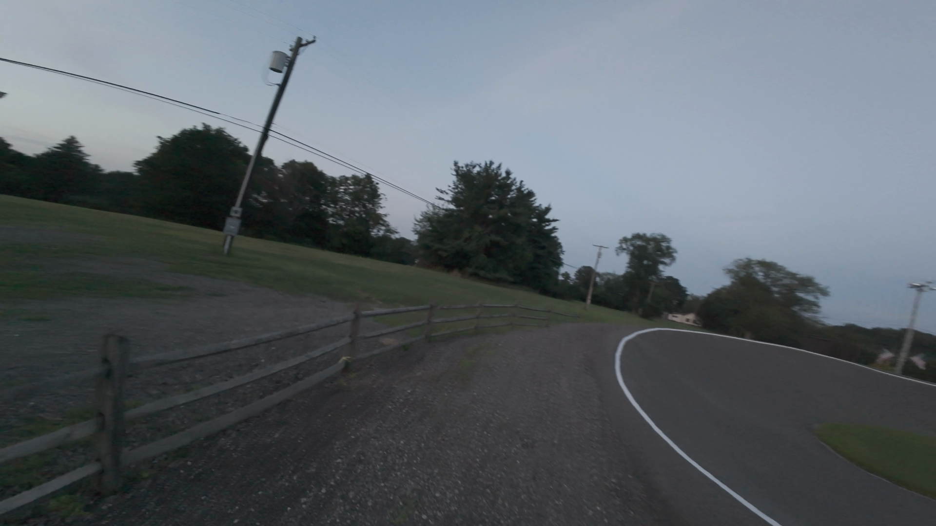 The video captures a wide shot of a curvy dirt track at South Park BMX. The track curves gently with a wooden splitrail fence marking the boundary on the left. Overhead power lines and utility poles flank the track on either side, and a clear sky stretches above the green hillside terrain. The scene is dimly lit, suggesting an early morning or late afternoon time of day, as the track and surrounding area are well-lit by natural sunlight.