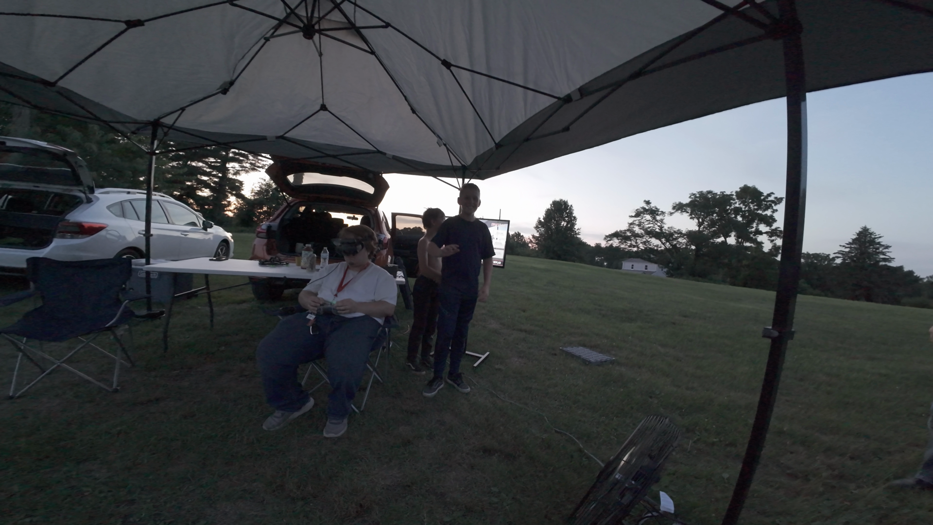 Under a large white pop-up tent on a grassy field, three individuals are seated: one is seated using a chair and wearing a light-colored shirt, engaging with a VR headset, suggesting a virtual event within the context of a BMX meet. Two individuals are standing beside him, dressed casually in darker shirts and jeans. The setting appears quiet and informal, with parked cars visible in the background, indicating preparation or relaxation areas possibly for event attendees. The scene captures a moment of casual interaction and technical preparation, blending virtual with real-world participation in the outdoor venue.