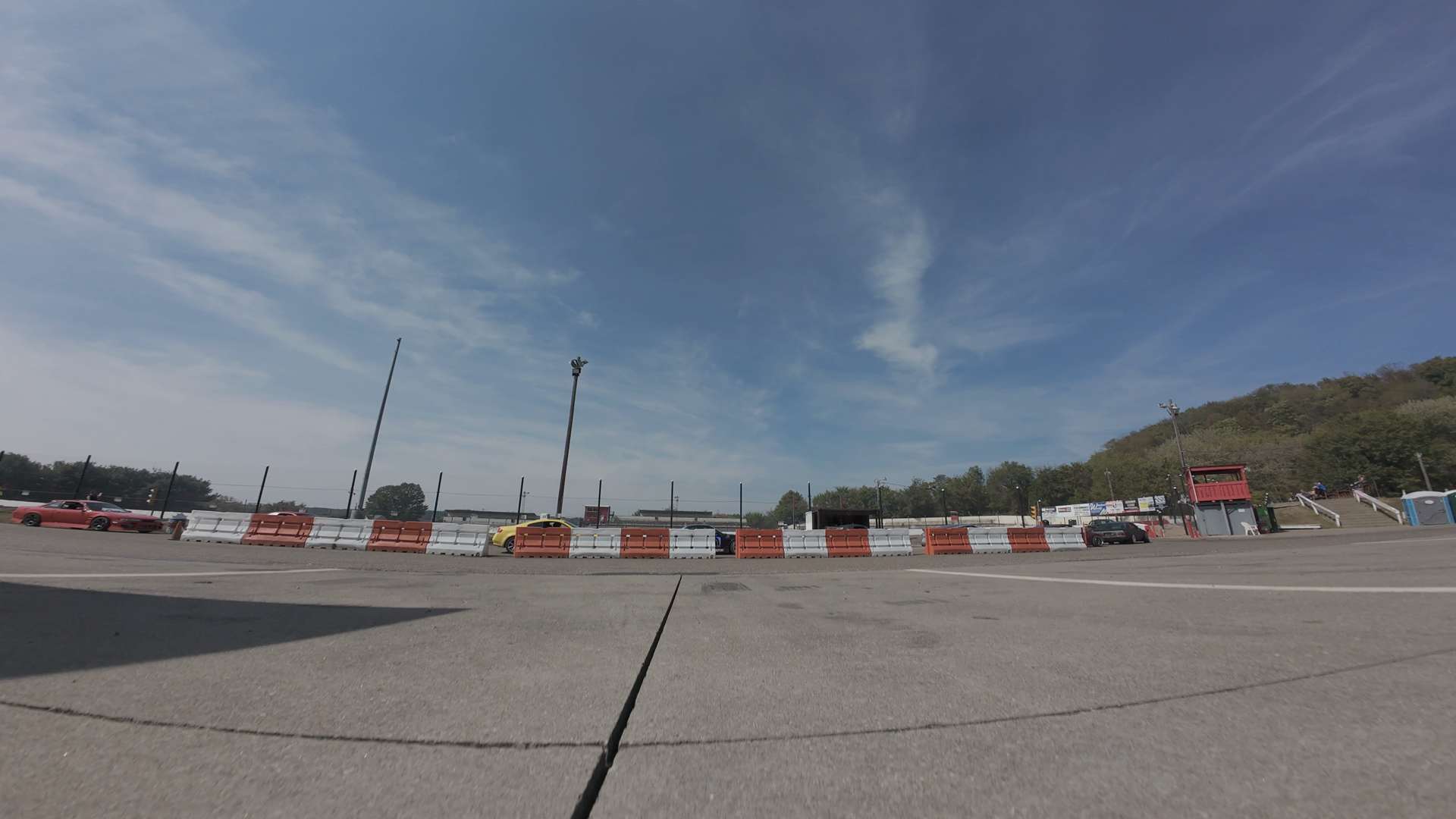The image captures a wide view of a carpark with a long barrier across the middle. The barrier is striped in red and white sections, demarcating the end of the raceway that is out of frame. The foreground shows a smooth asphalt surface with visible cracks, leading to a paved area. There are no vehicles or people in the immediate foreground, but a yellow car is visible on the left side of the frame, and a red raceway shelter is seen on the right. The background is sparsely populated, featuring a few trees and a clear blue sky with minimal clouds.