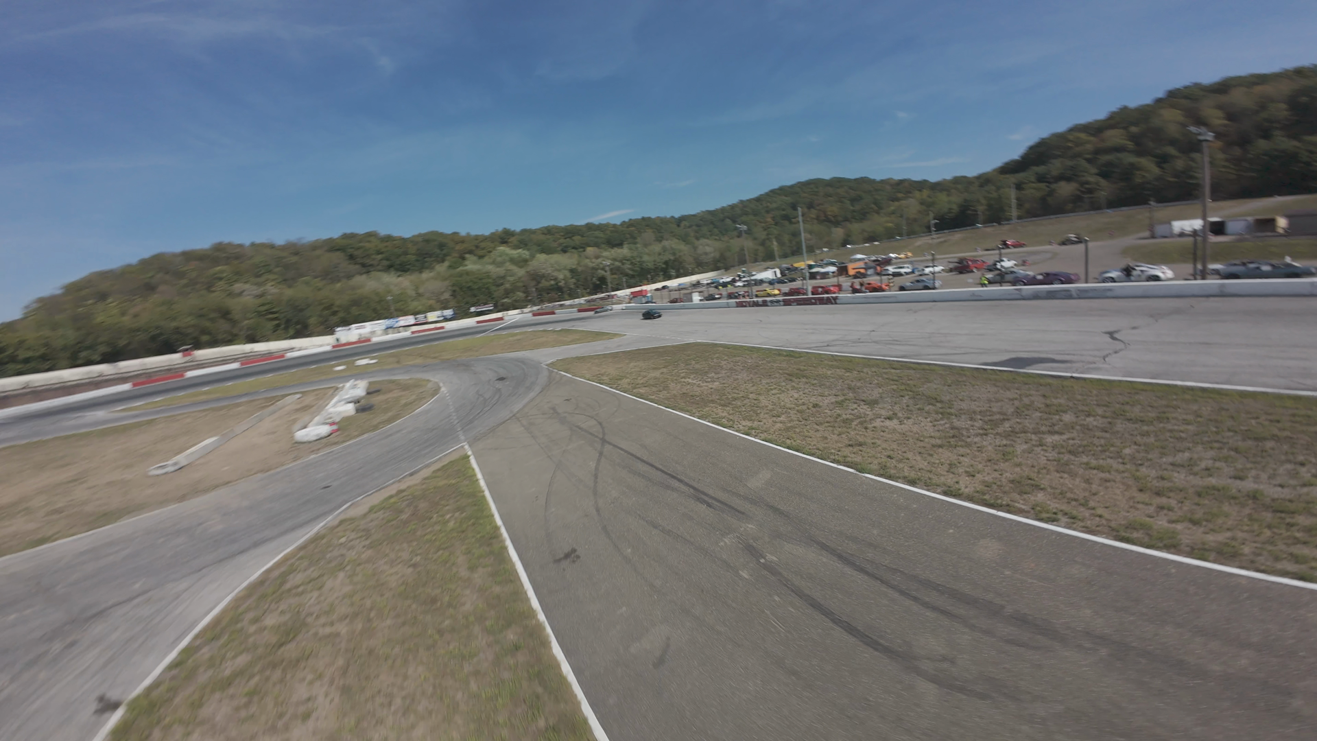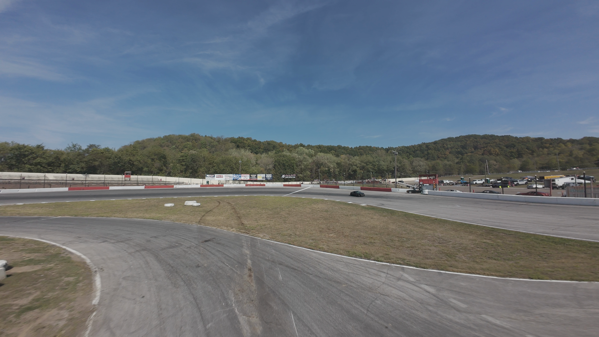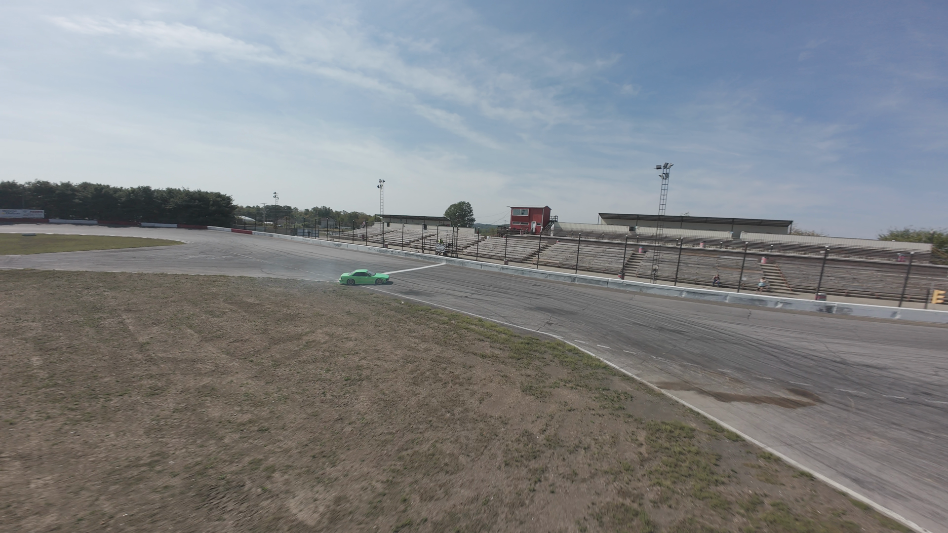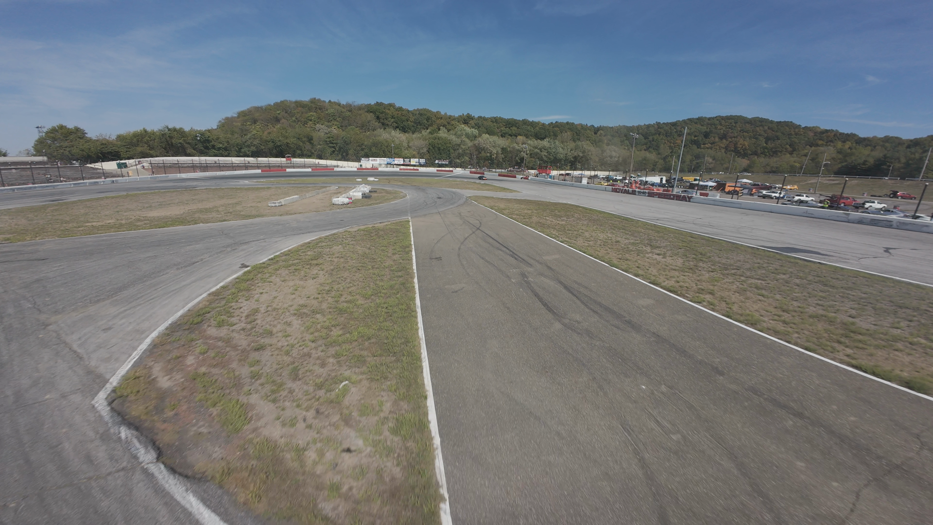 The image shows a view of a racetrack from a drone, specifically a part of the Midvale Speedway. The track is bordered by tire curbing at the edge, with grassy areas visible on the right side. There are no vehicles or drivers in the image, and the scene is devoid of spectators or activity. The sky is clear, suggesting a sunny day. The track has visible tire marks and wear, indicative of prior race sessions or practice runs. The area beyond the track shows other buildings and greenery, typical of a speedway's surroundings.