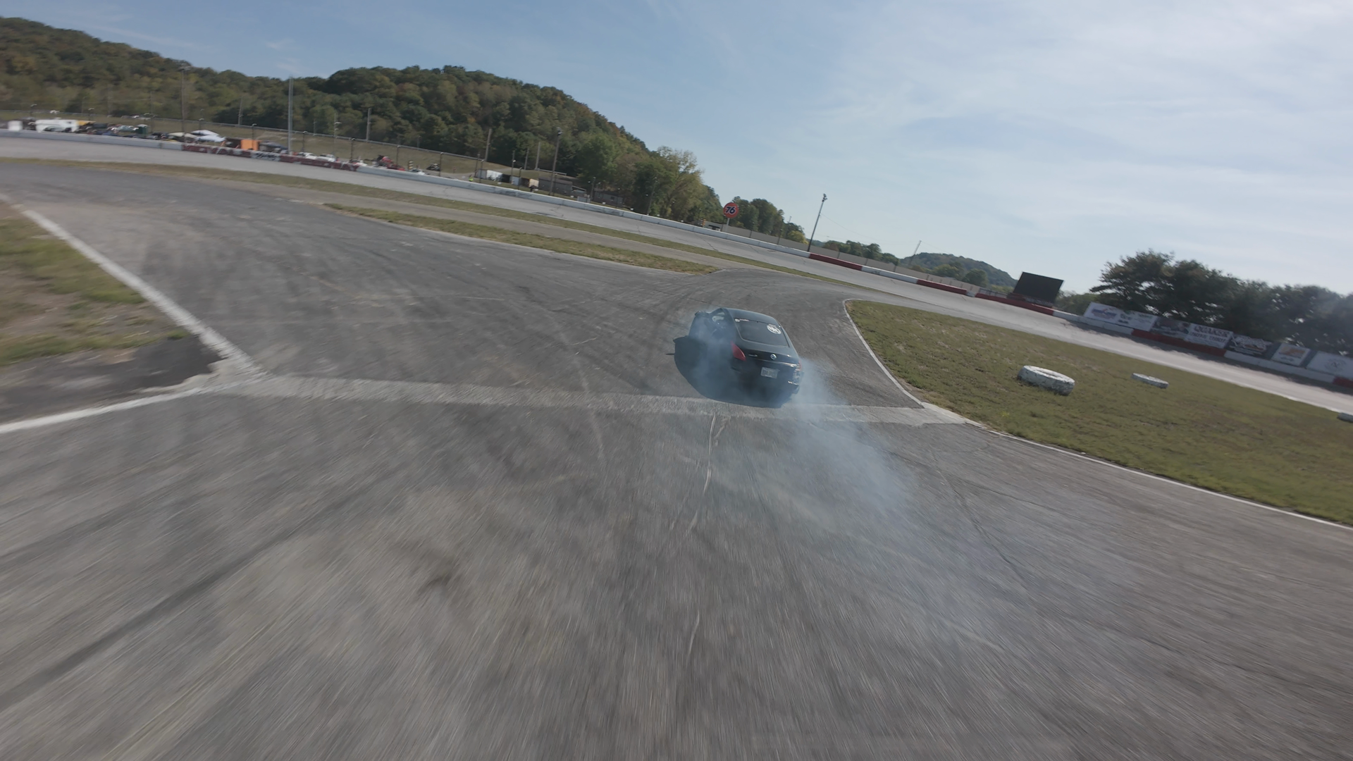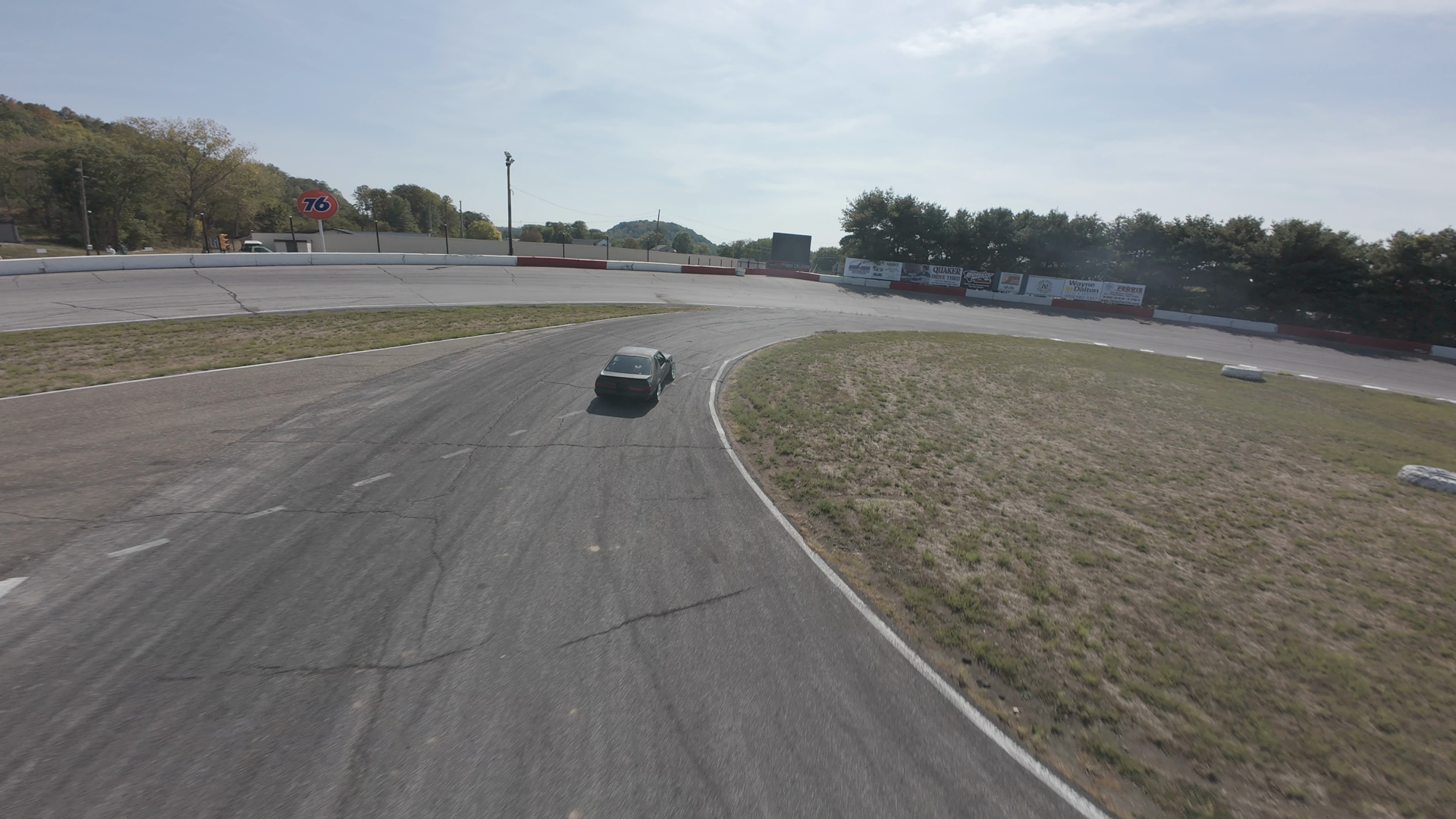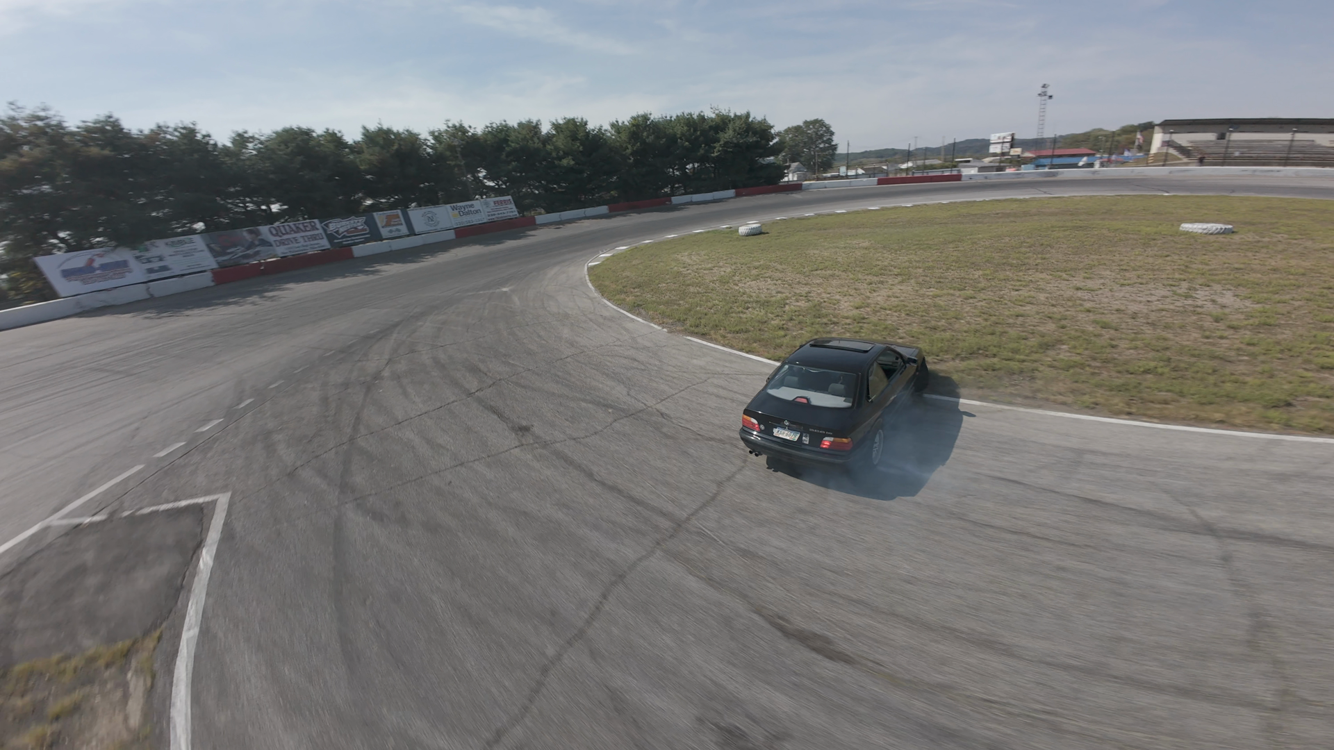A dark-colored BMW is captured from an aerial perspective as it drives on the curved asphalt track of Midvale Speedway. The car is navigating through a bend, leaving visible tire marks on the road. The surrounding area includes fencing and a grassy embankment, with some buildings visible in the background. The clear blue sky suggests a sunny day, and the pavement looks well-maintained. No drivers or spectators are visible in the image.