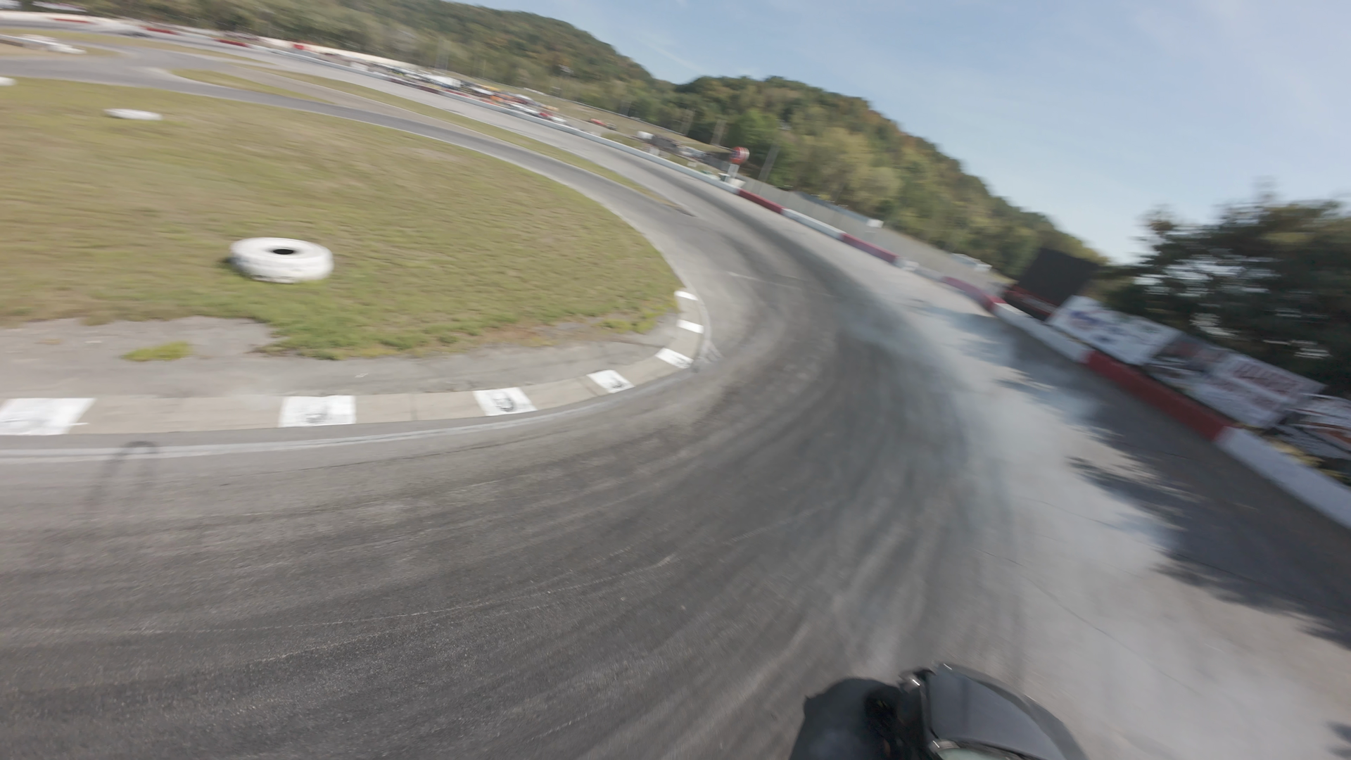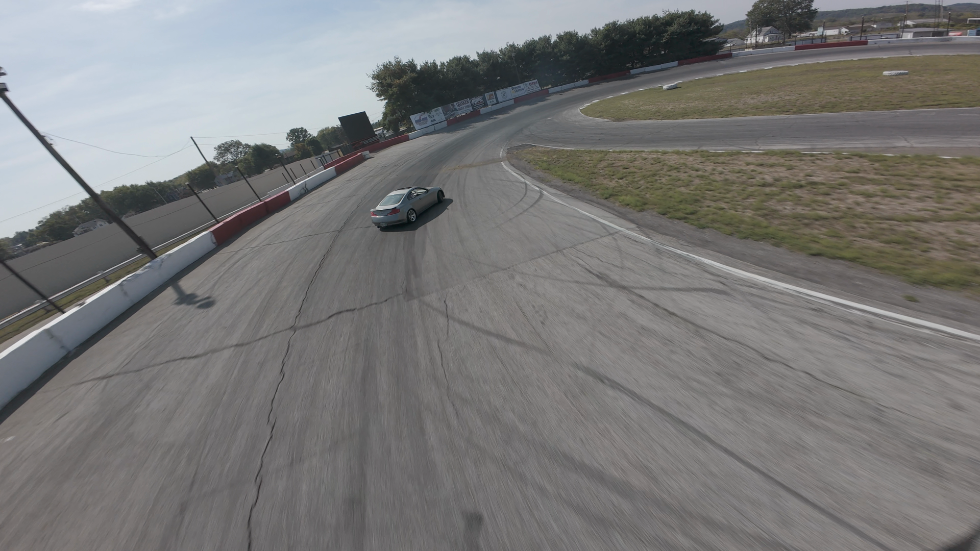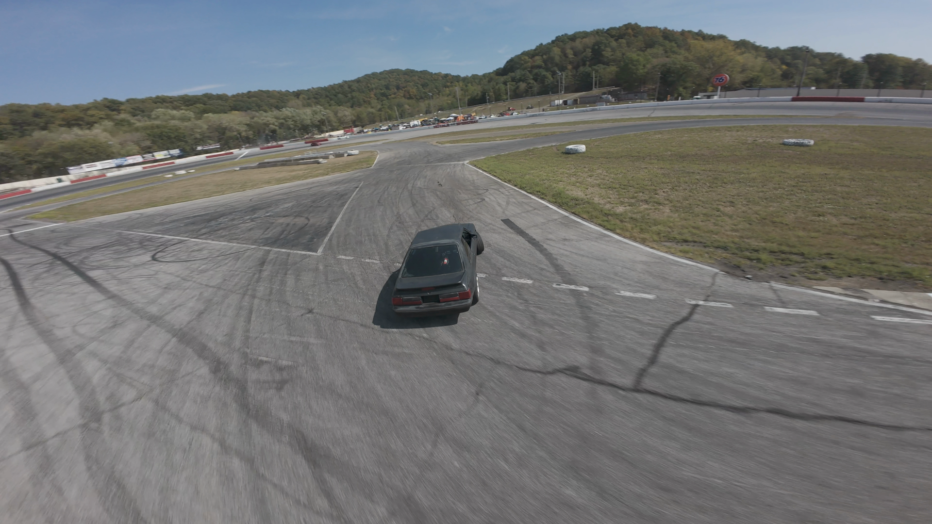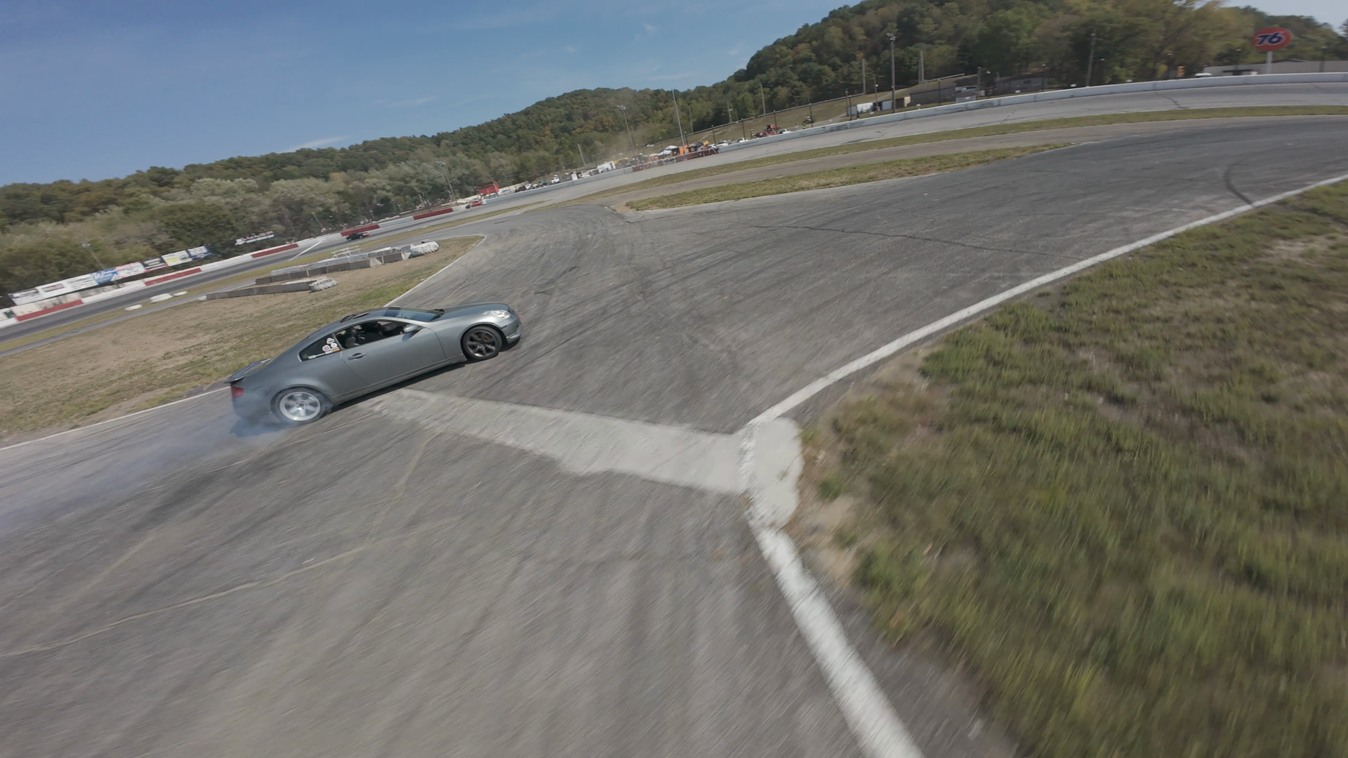 A dark-colored BMW is captured from an aerial perspective as it drives on the curved asphalt track of Midvale Speedway. The car is navigating through a bend, leaving visible tire marks on the road. The surrounding area includes fencing and a grassy embankment, with some buildings visible in the background. The clear blue sky suggests a sunny day, and the pavement looks well-maintained. No drivers or spectators are visible in the image.