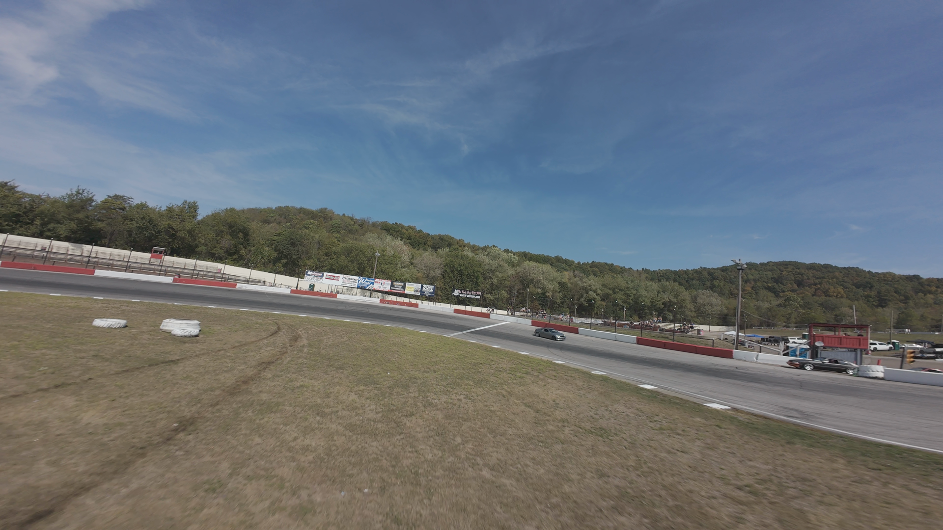 The image shows an outdoor race track on a sunny day, characterized by a wide asphalt circuit surrounded by grass and trees. The track has visible skid marks from recent activity, and a single car is seen driving near the edge of the track, close to the grassy area. The scene is open with a clear blue sky above and some parked vehicles in the background near the track's periphery. The overall ambiance is calm, with no apparent racing activity at this moment, suggesting the race might be either starting or concluding.