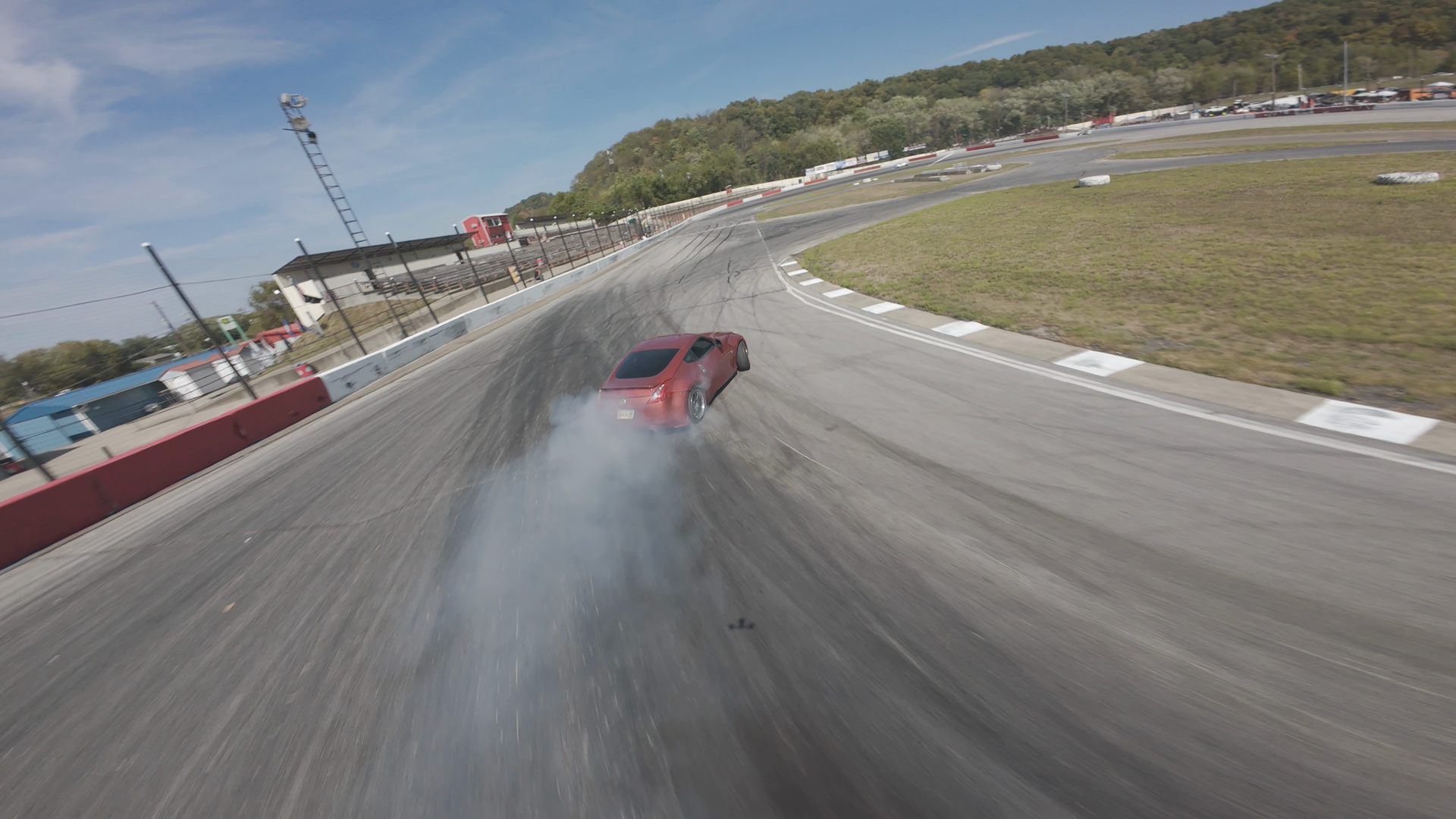 A red Nissan GT-R is shown drifting aggressively on a paved track. The car is releasing a significant amount of smoke from its rear tires, indicating heavy acceleration and control. The camera angle suggests a FPV drone shot, providing a dynamic perspective of the car's movement. In the background, spectators or other track-side areas are faintly visible, with structures and fencing lining the boundaries of the track. The scene suggests a drift event, with the emphasis on the driving technique and handling of the vehicle. The excitement level is moderate, rated at 3.5. The car's tires grip the tarmac to the extent that skid marks are visible, showcasing its powerful engine and skilled driver.