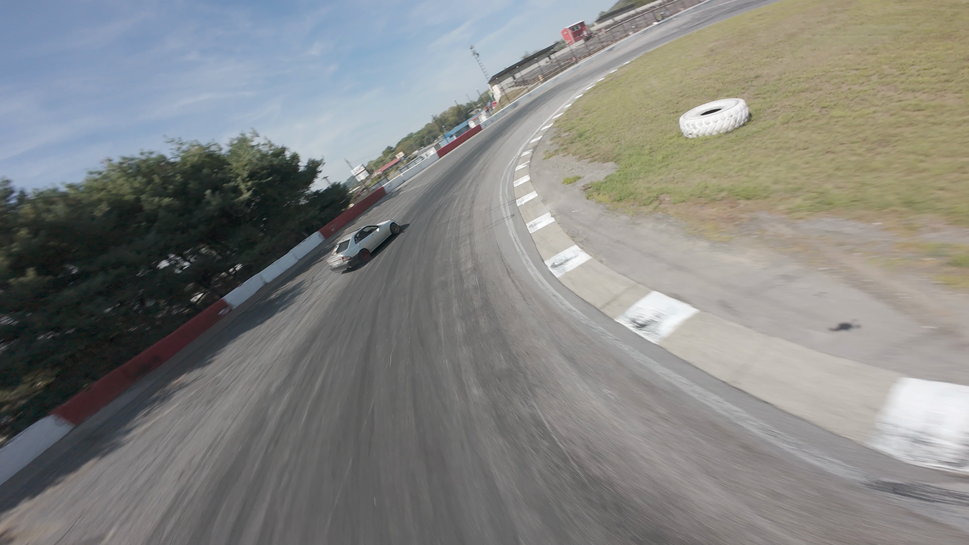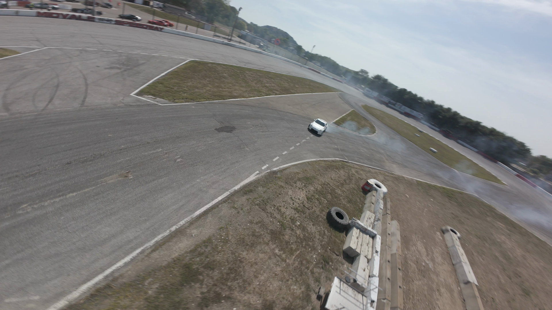 The image captures a dynamic scene of a car drifting on a racetrack as seen from an FPV drone perspective. A car is navigating a curve, kicking up a trail of smoke, indicating heavy use of the throttle and speed. The racetrack appears to be well-maintained with white boundary lines marking the track. In the background, several sponsor signs and advertisements are visible along the track fencing, suggesting a professional event or club day drift. The environment suggests a sunny day with clear skies, enhancing the visibility of the action. The excitement level of this image is moderate due to its steady, focused shot of the car and its performance on the track.