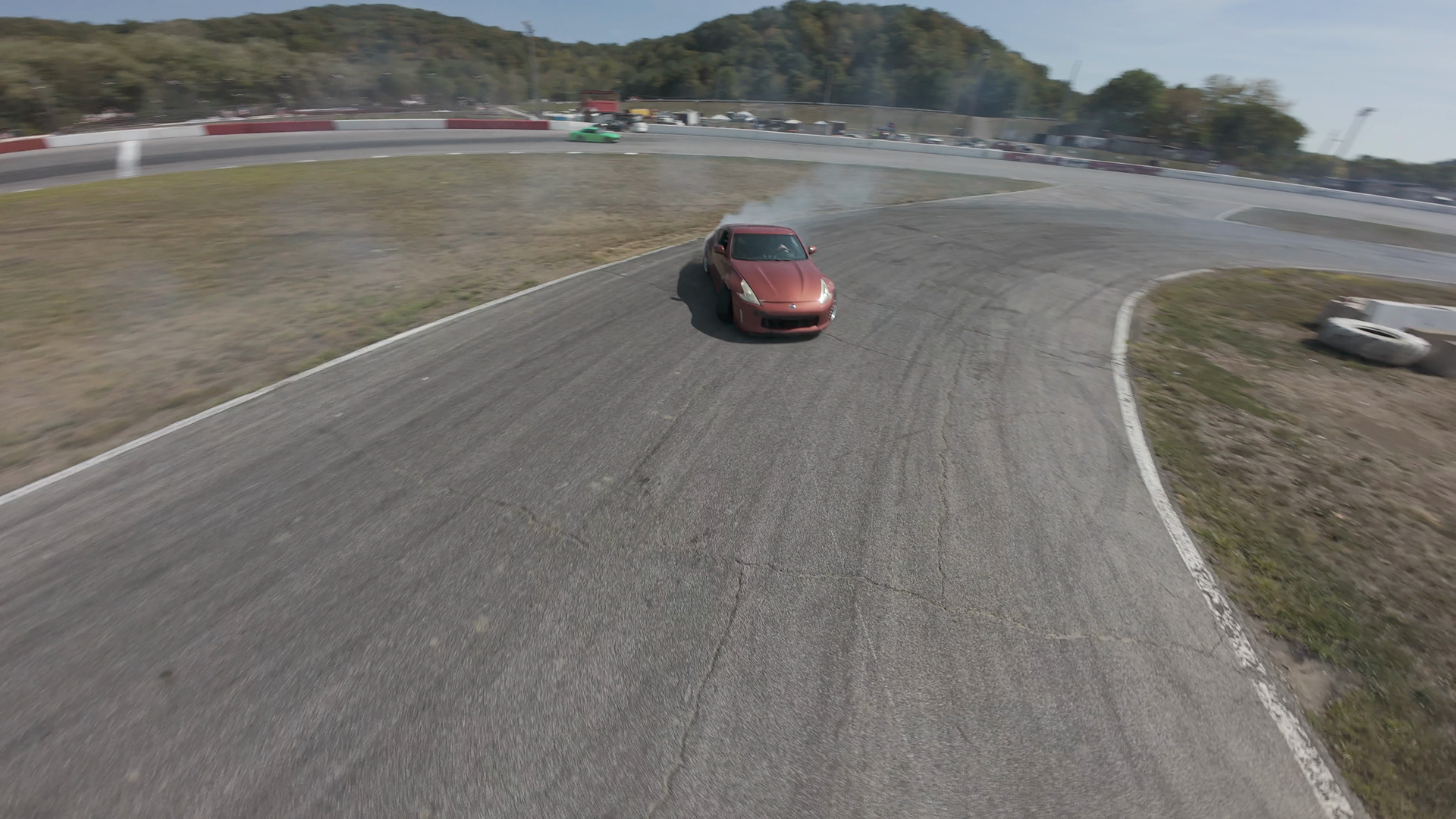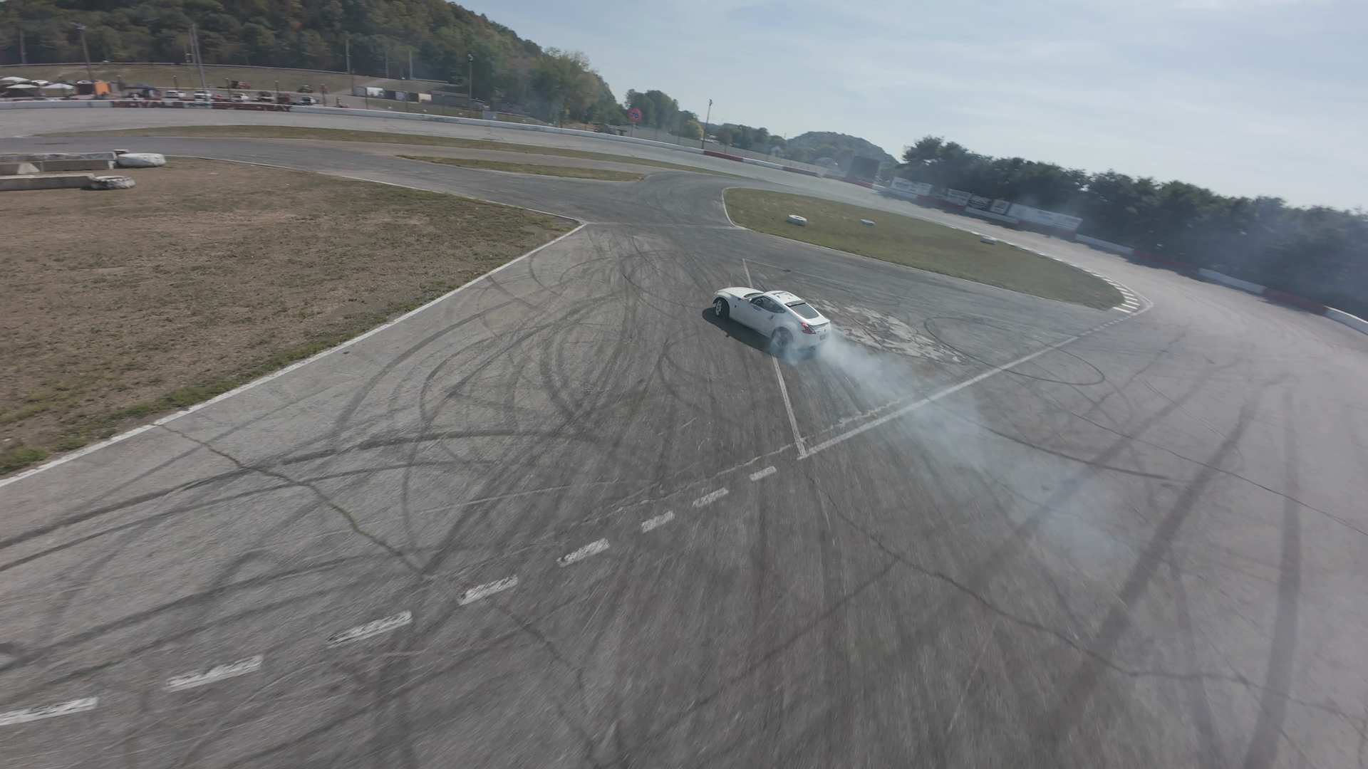 An aerial view of a white 2013 Nissan 370Z performing a drifting maneuver on the racetrack at Midvale Speedway. The car is leaving a trail of smoke due to the drift. The tarmac is worn with multiple tire marks and the environment shows the curve of the track with its surroundings of grassy areas and distant trees. The scene suggests a clear day with good visibility.