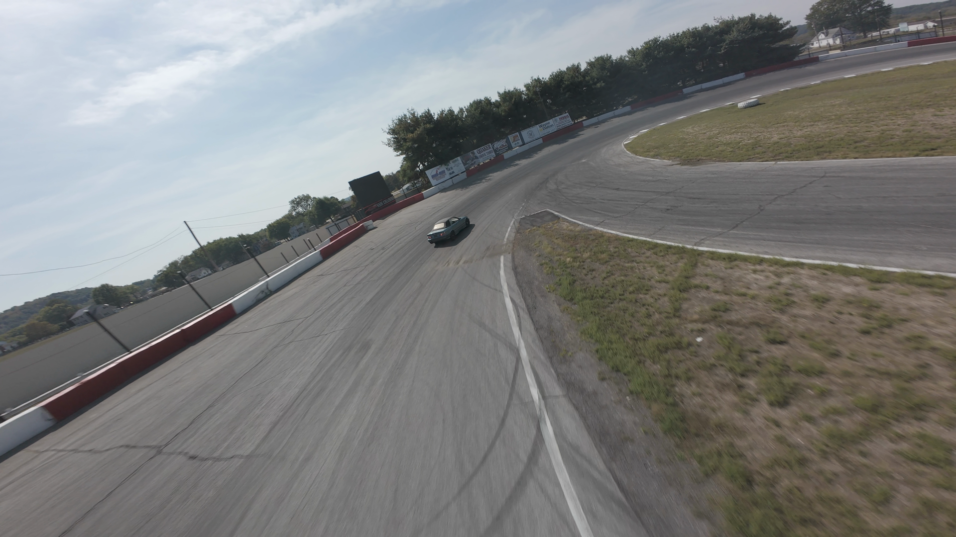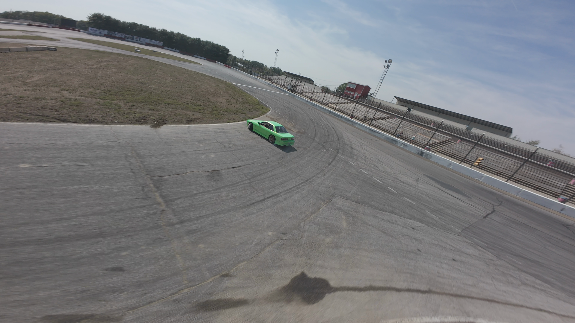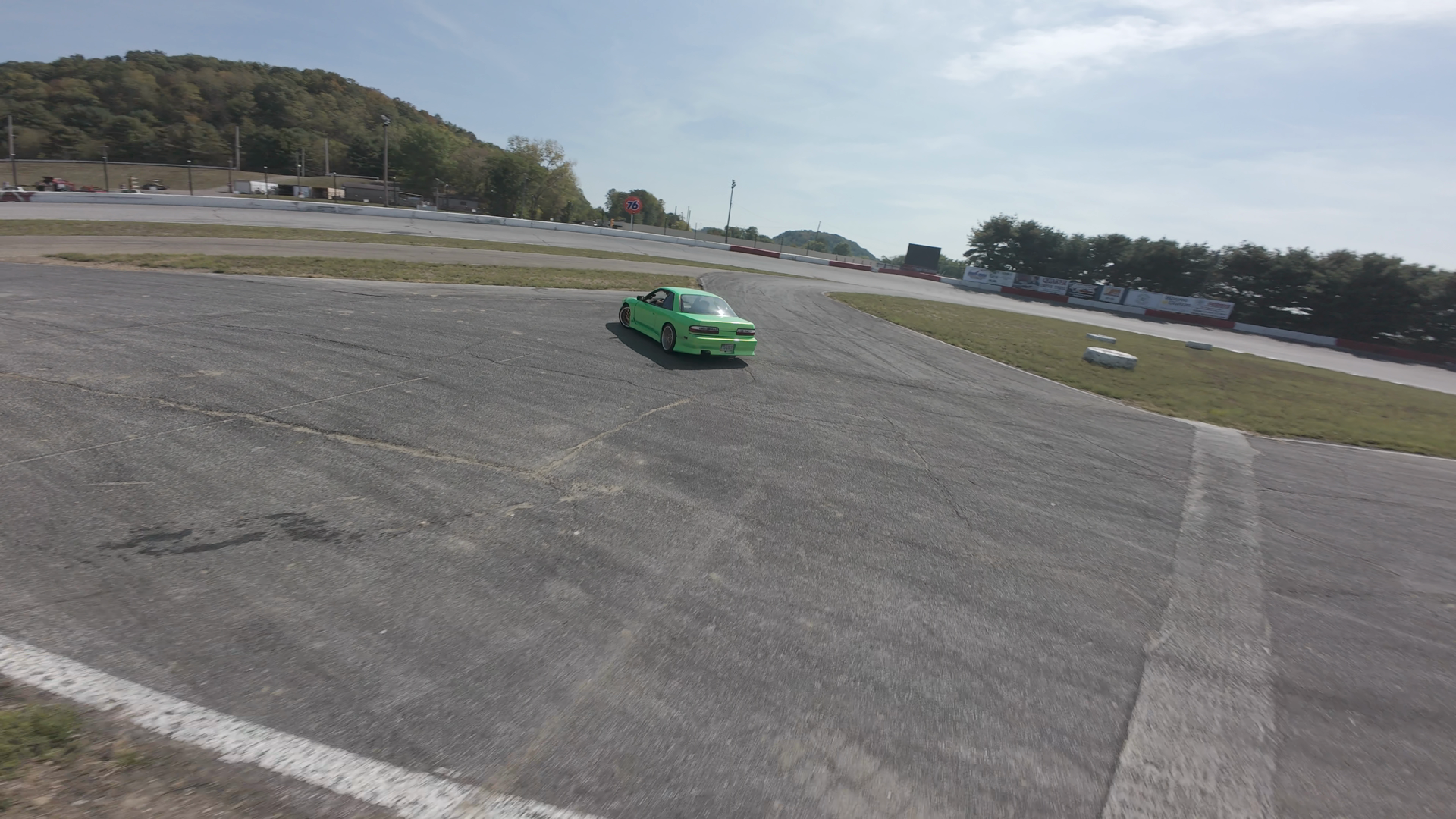 A green sports car is seen from a low-angle aerial view on Midvale Speedway's track. The car is positioned near the middle of a corner, close to the curbing. The track is bordered by a red and white wall, and the surrounding area includes grass and some trees with a clear sky. The car appears to be in good condition, with no visible scratches or damages. The setting suggests a racing or driving event, given the layout of the track and the absence of people or additional cars in the immediate vicinity.