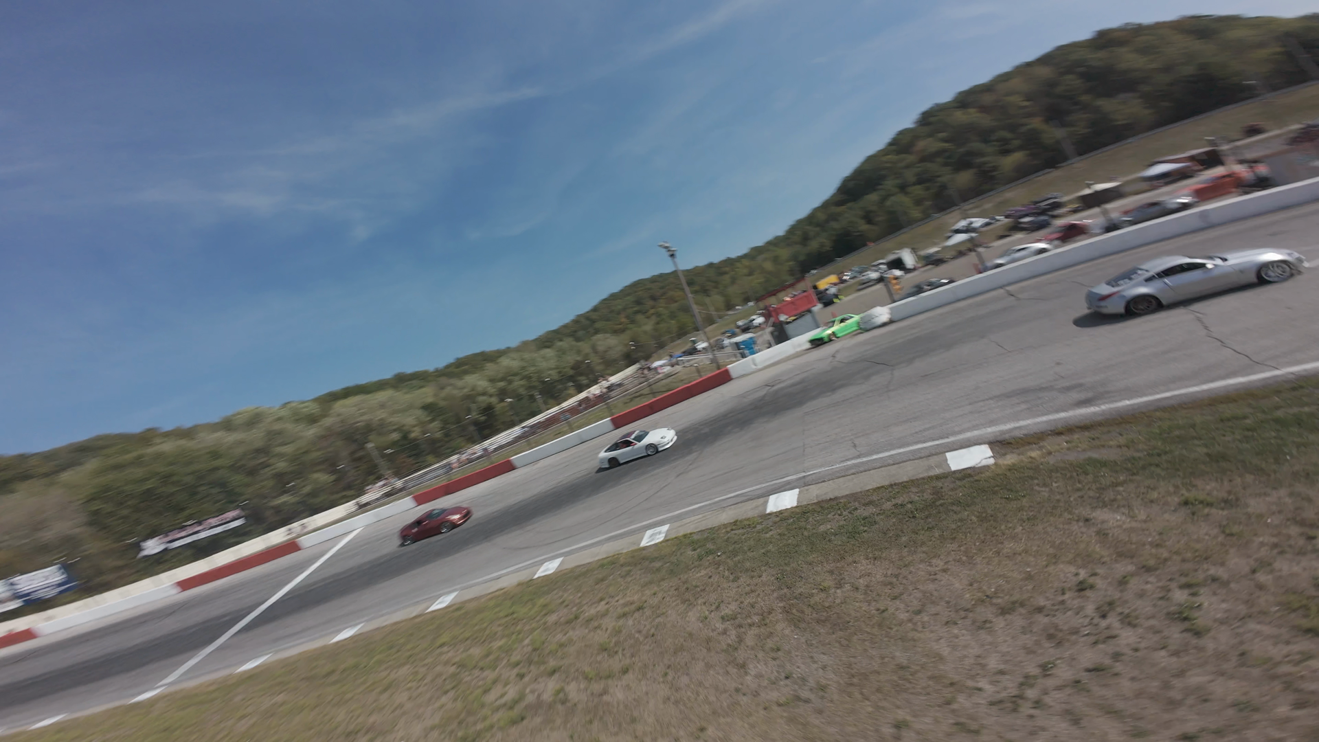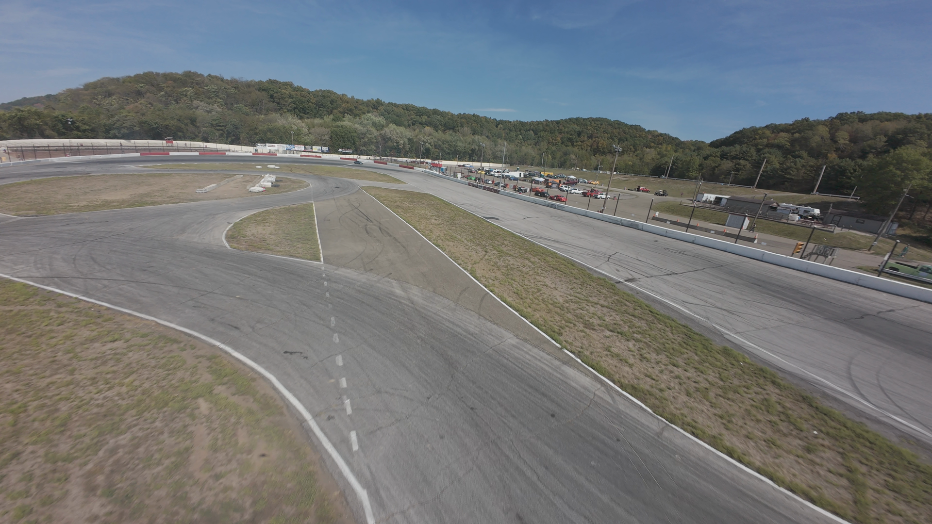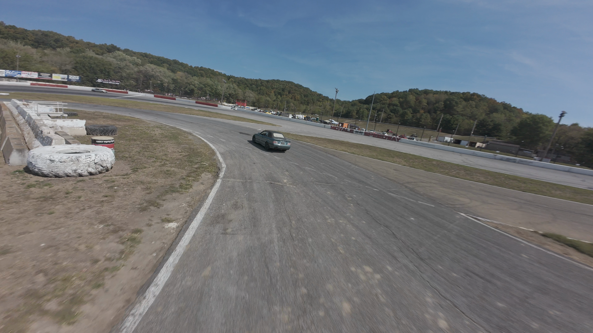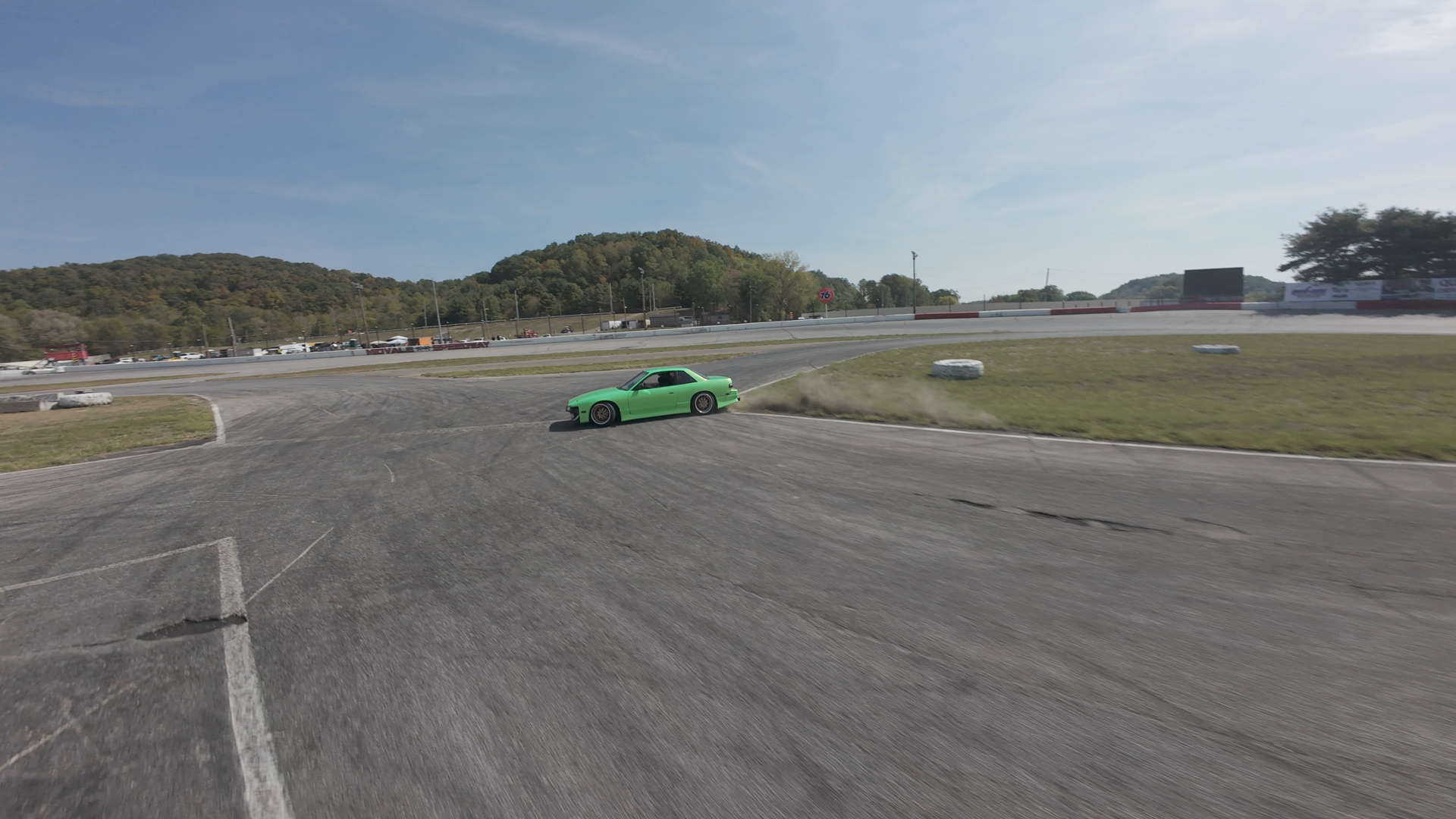 A green sports car is seen from a low-angle aerial view on Midvale Speedway's track. The car is positioned near the middle of a corner, close to the curbing. The track is bordered by a red and white wall, and the surrounding area includes grass and some trees with a clear sky. The car appears to be in good condition, with no visible scratches or damages. The setting suggests a racing or driving event, given the layout of the track and the absence of people or additional cars in the immediate vicinity.