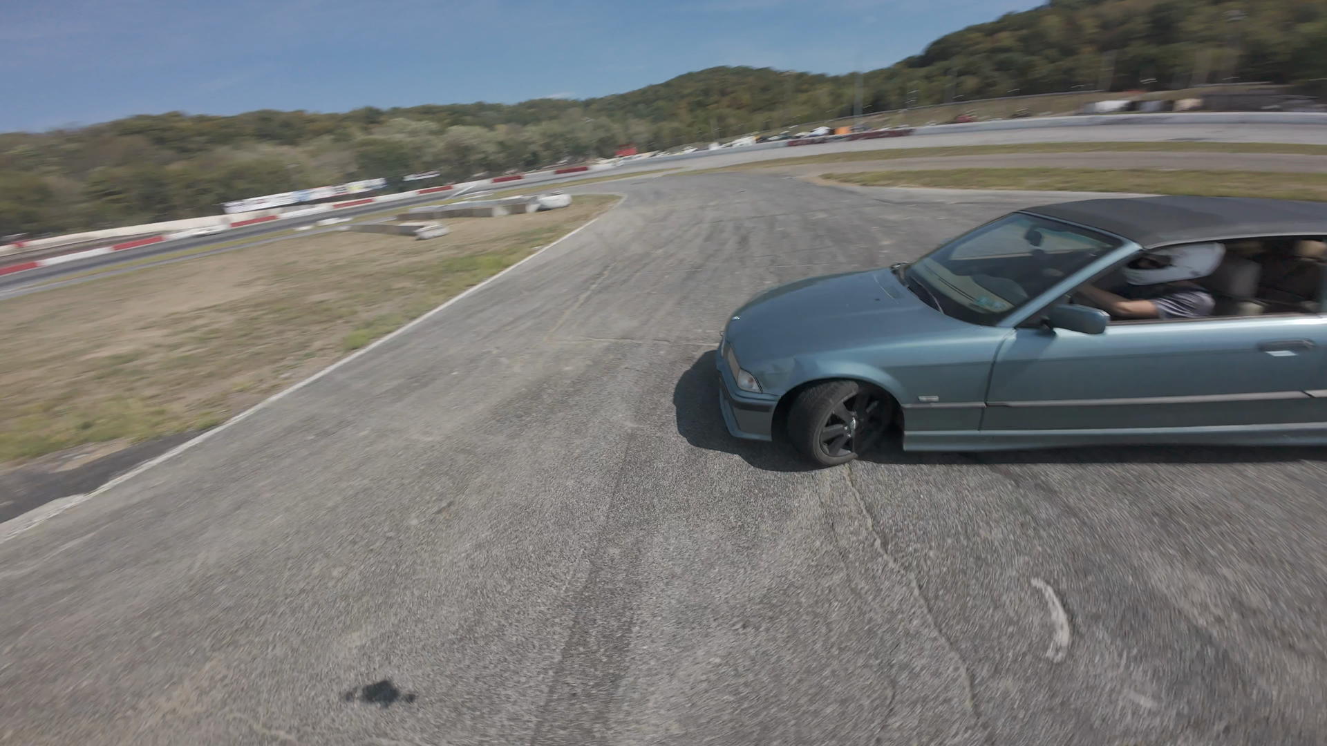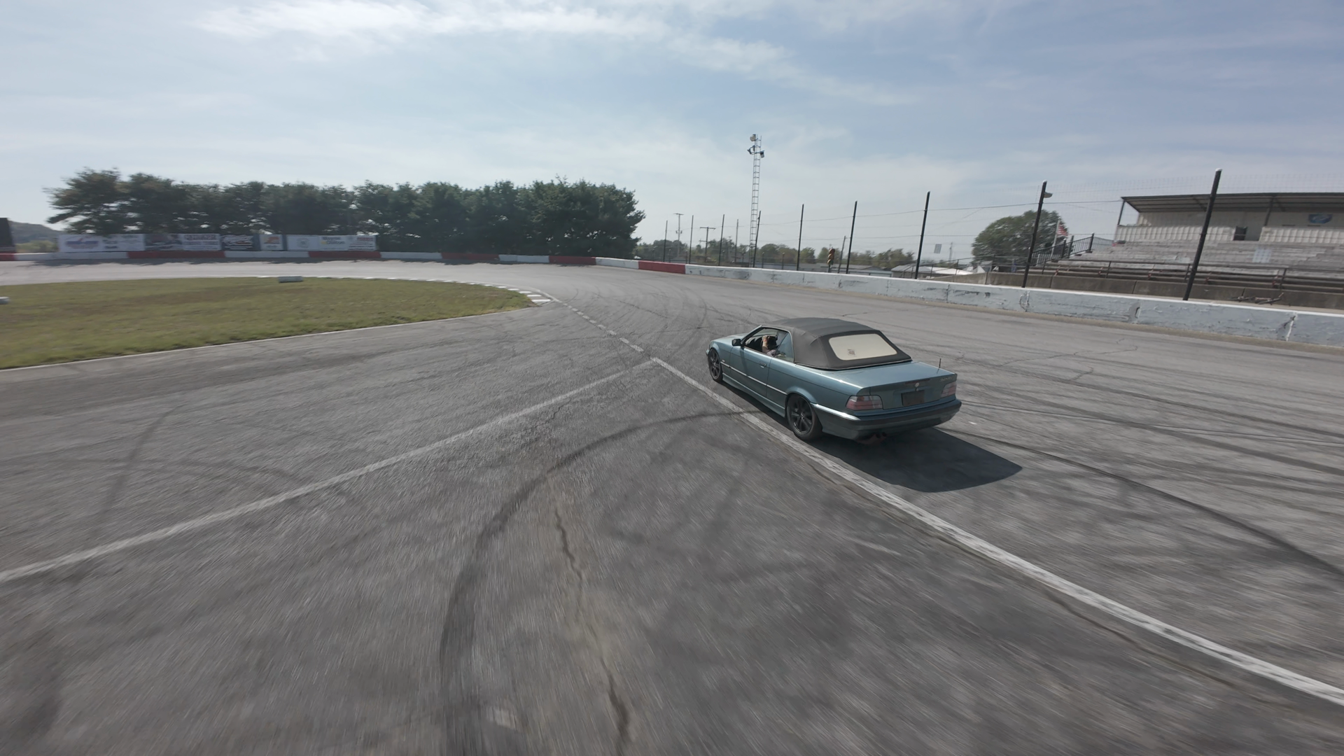 A light blue convertible BMW is drifting on a racetrack at Midvale Speedway, showcasing its turn at a curved section of the track. The driver, identifiable from a figure in the driver's seat, navigates the car with skillful maneuvering, keeping a close line to the track. The scene is set on a bright, clear day with visible tire marks on the smooth asphalt, indicating prior activity from multiple drivers. The background shows a distant building and fencing, typical of a raceway environment. The car appears to be in good condition with no visible damage. The excitement of the scene is high, indicated by the sharp turn of the vehicle.
