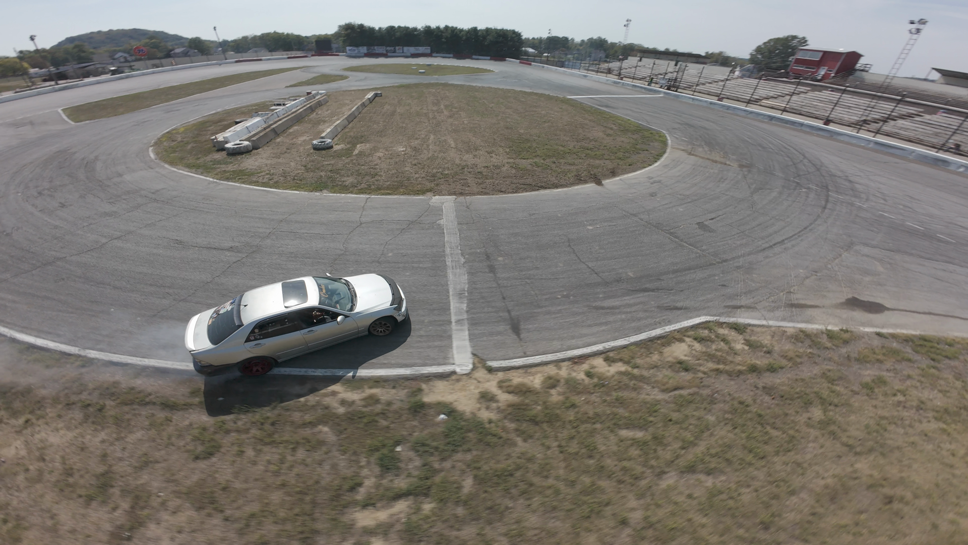 An aerial shot captures a silver sedan drifting around a curve at Midvale Speedway. The car is in motion, with visible smoke from the tires indicating high speed and braking traction. The track's asphalt is marked with tire tracks from frequent use, and the surroundings show a clear day with patches of grass and dirt around the perimeter area. The car is positioned on the right side of the track, close to the guardrails, showcasing precise driftlining. The overall scene conveys a dynamic and high-energy drift event, with a focus on the driver's skill。