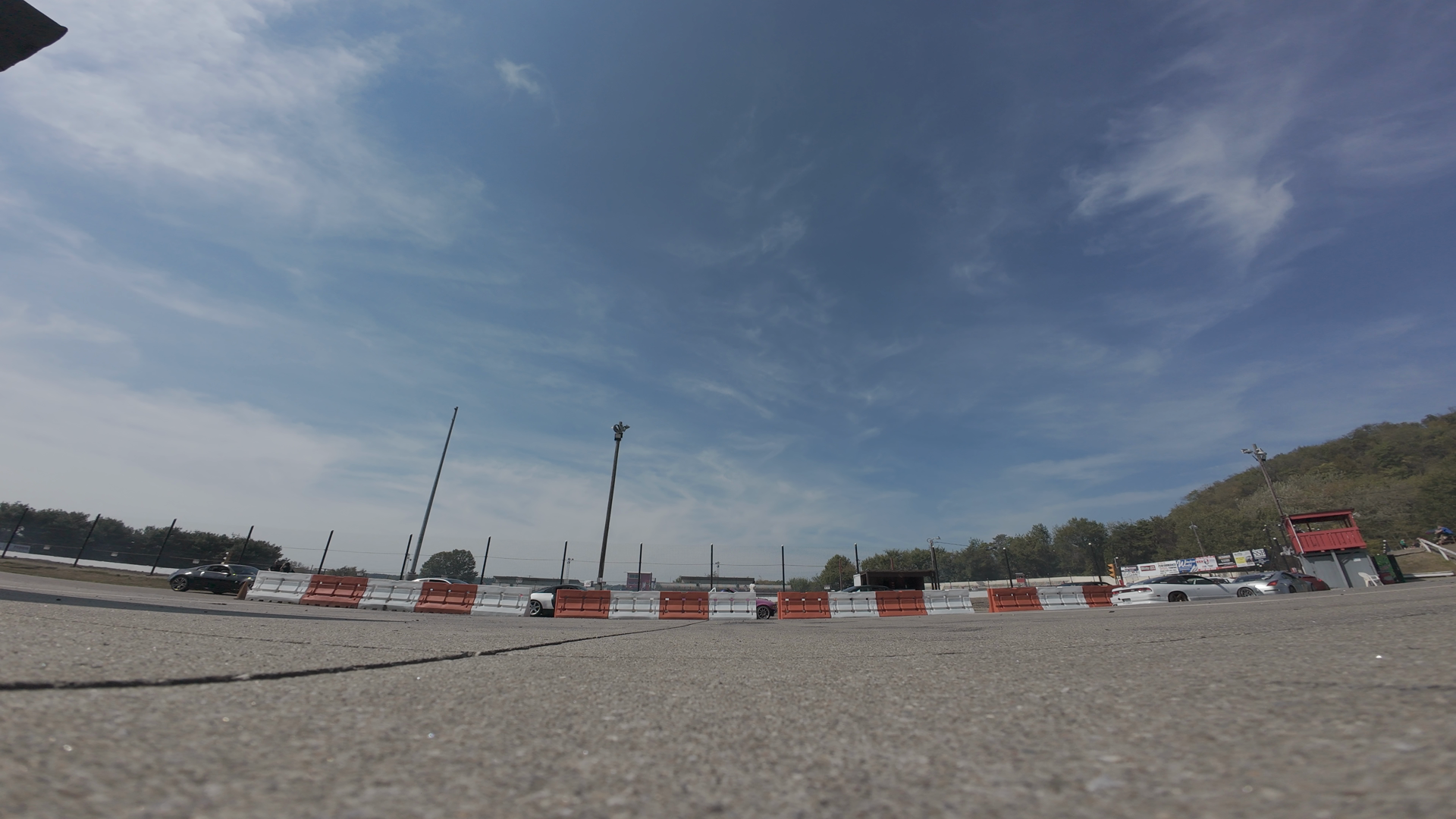 The image shows a wide view of an outdoor race track with a clear asphalt surface. There are orange and white barricades lining the track, and in the background, several parked cars and a small red spectator stand can be spotted. Spectators are visible, standing and sitting on bleachers. The sky is blue with some scattered white clouds. The scene suggests a preparation or pre-viewing stage before an event. The ground shows recent tire marks, likely from practice runs or earlier action.
