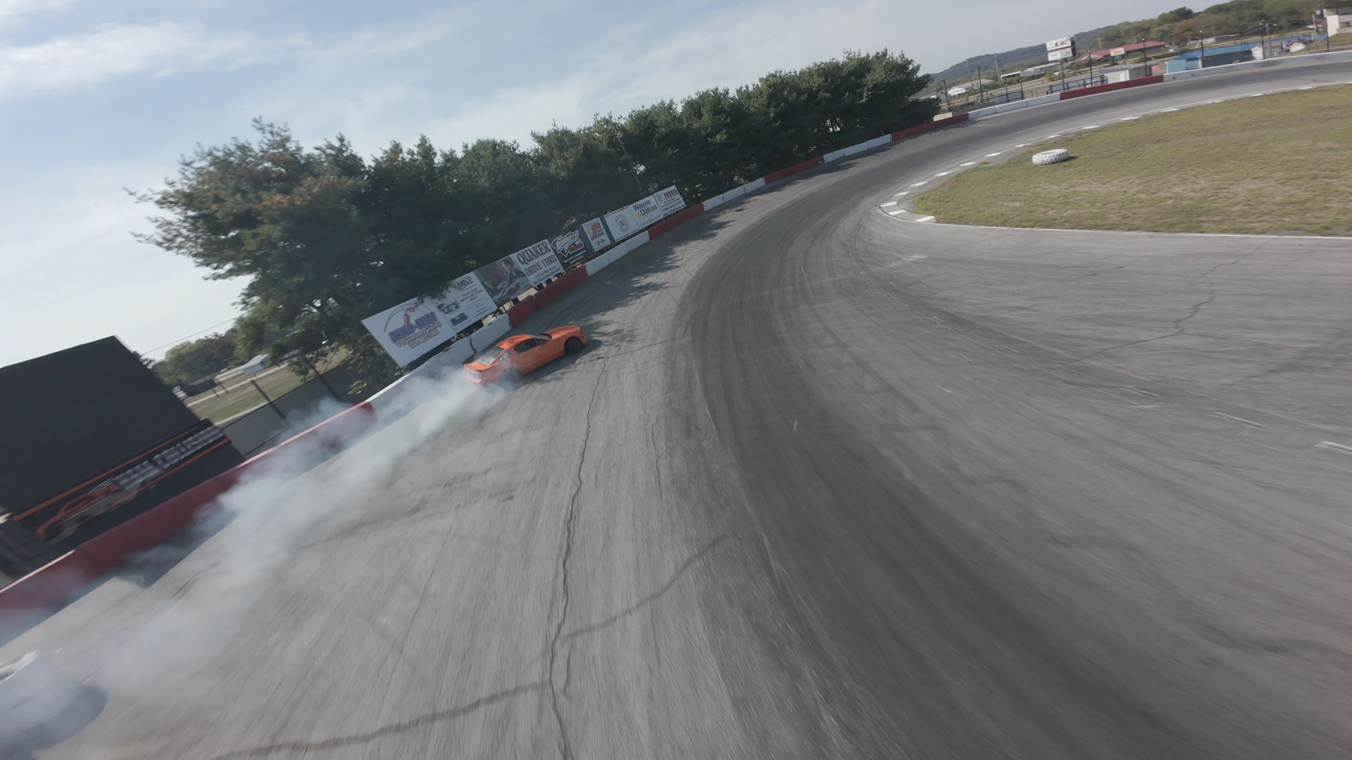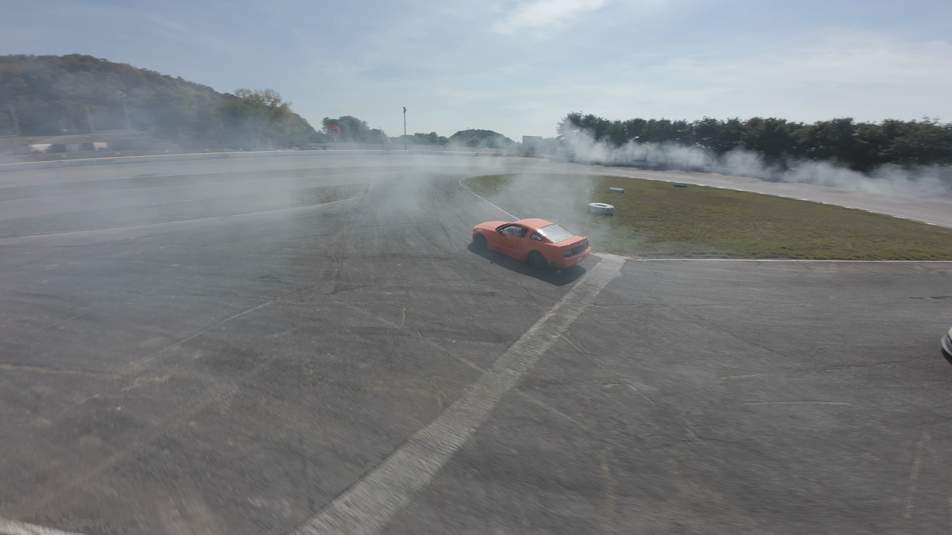 A bright orange Mustang is drifting at Midvale Speedway, creating a trail of smoke as it slides sideways on the track. The car is positioned near the center of the track, maintaining a smooth arc as it navigates a curve. The surrounding area is spacious with green grass and trees visible in the background under a clear blue sky. Smoke from the tires is spreading on the ground, indicating the car's speed and the intensity of drifting. No individuals are visible in the image, only the car and the track surface.