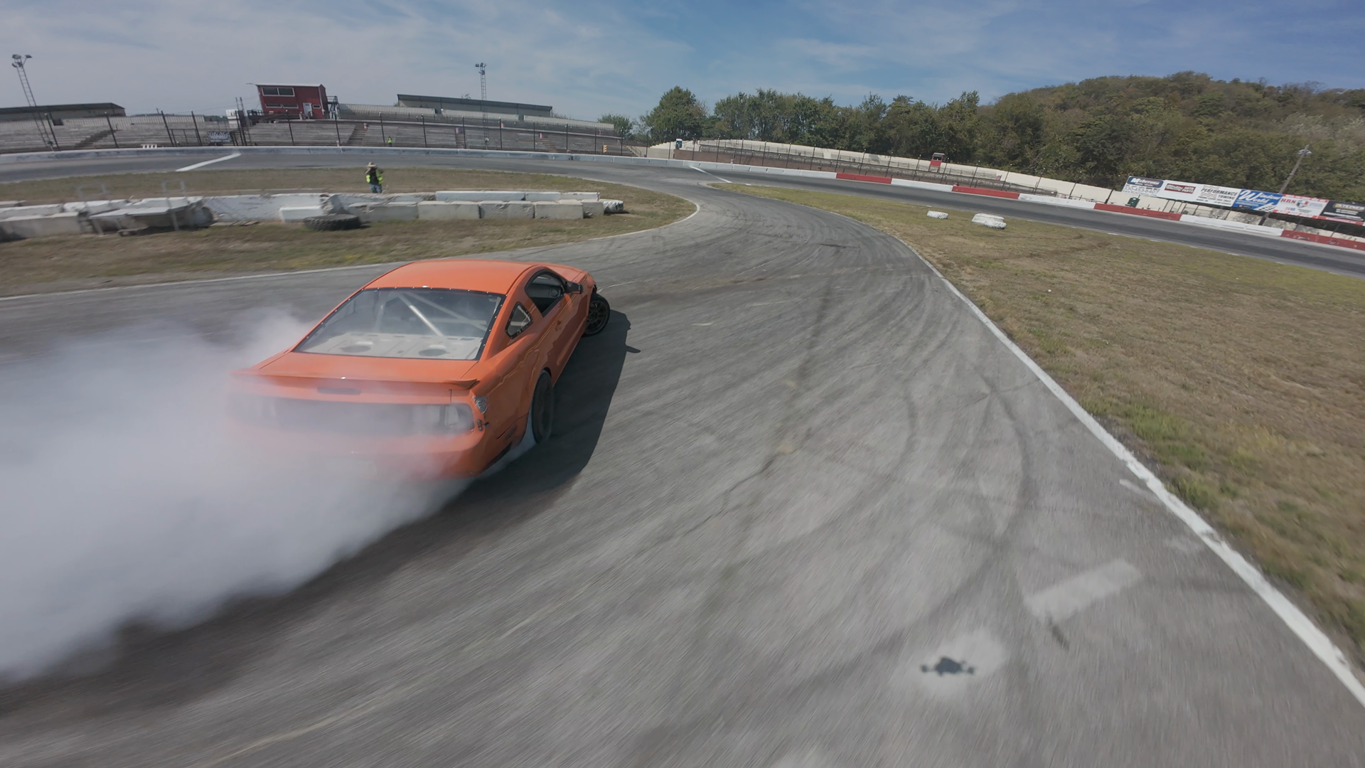 An orange drift car is captured in the middle of a drift at Midvale Speedway, sending a billow of smoke towards the front left. The car is racing on a curved asphalt track, with visible tire marks. The driver, inside the car, appears to be in control. The track features barriers and spectator areas with sparse vegetation and a few structures in the background. The scene conveys a sense of speed and precision, with the car leaving a trail of smoke that symbolizes its intensity and the driver’s mastery.