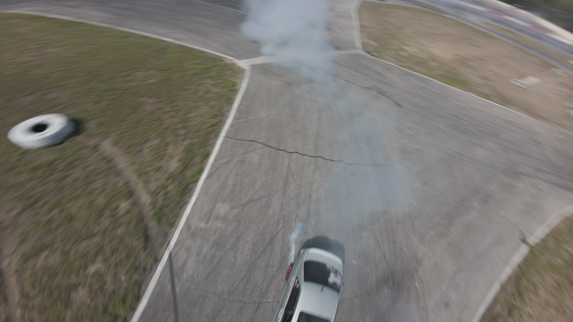 An aerial view captures a silver sports car performing a drift on the curves of Midvale Speedway. The car is actively generating smoke as it maneuvers around a bend, indicating powerful acceleration or a strong brake application. The surrounding area is a mix of asphalt track and grassy, undeveloped land, with a tire lying abandoned on the grass. The atmosphere is dynamic, with the car's tire marks visible on the track surface, emphasizing its speed and control in the corner. The excitement level of the scene is high, given the skillful handling of the vehicle and the sense of speed and power.
