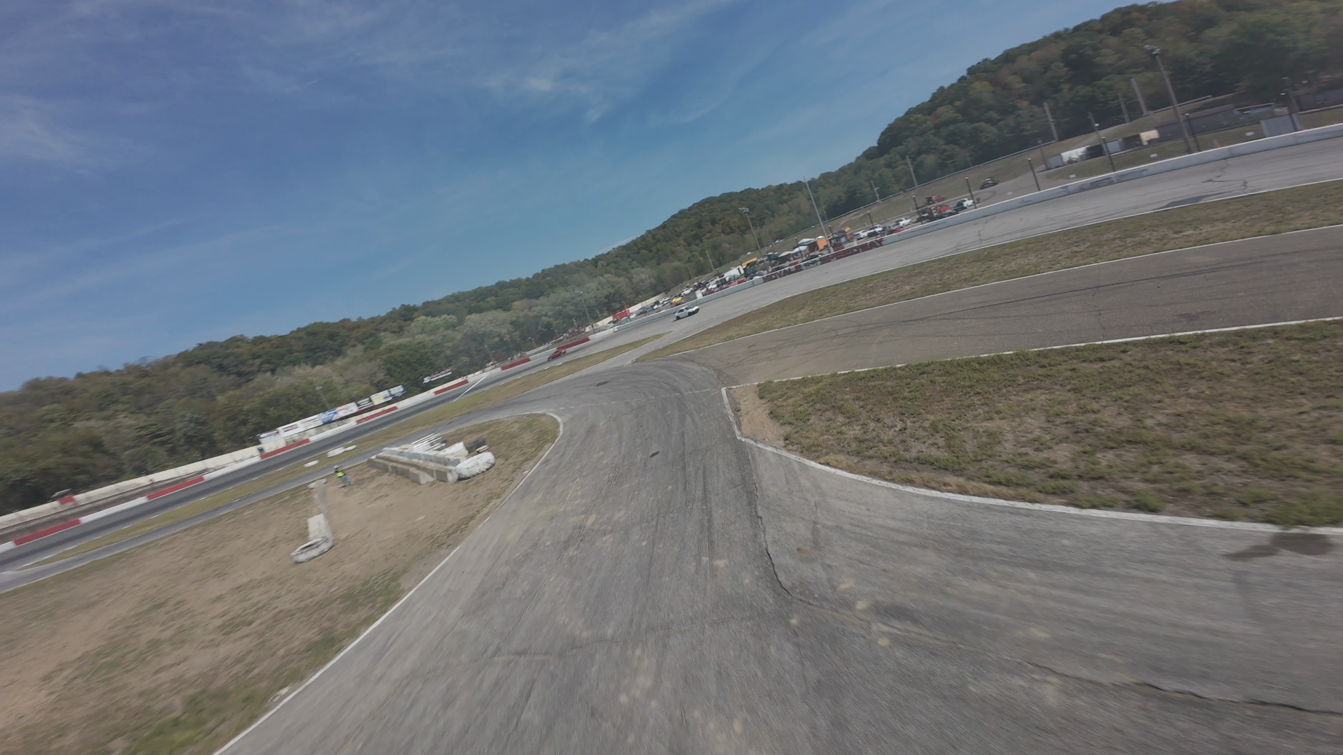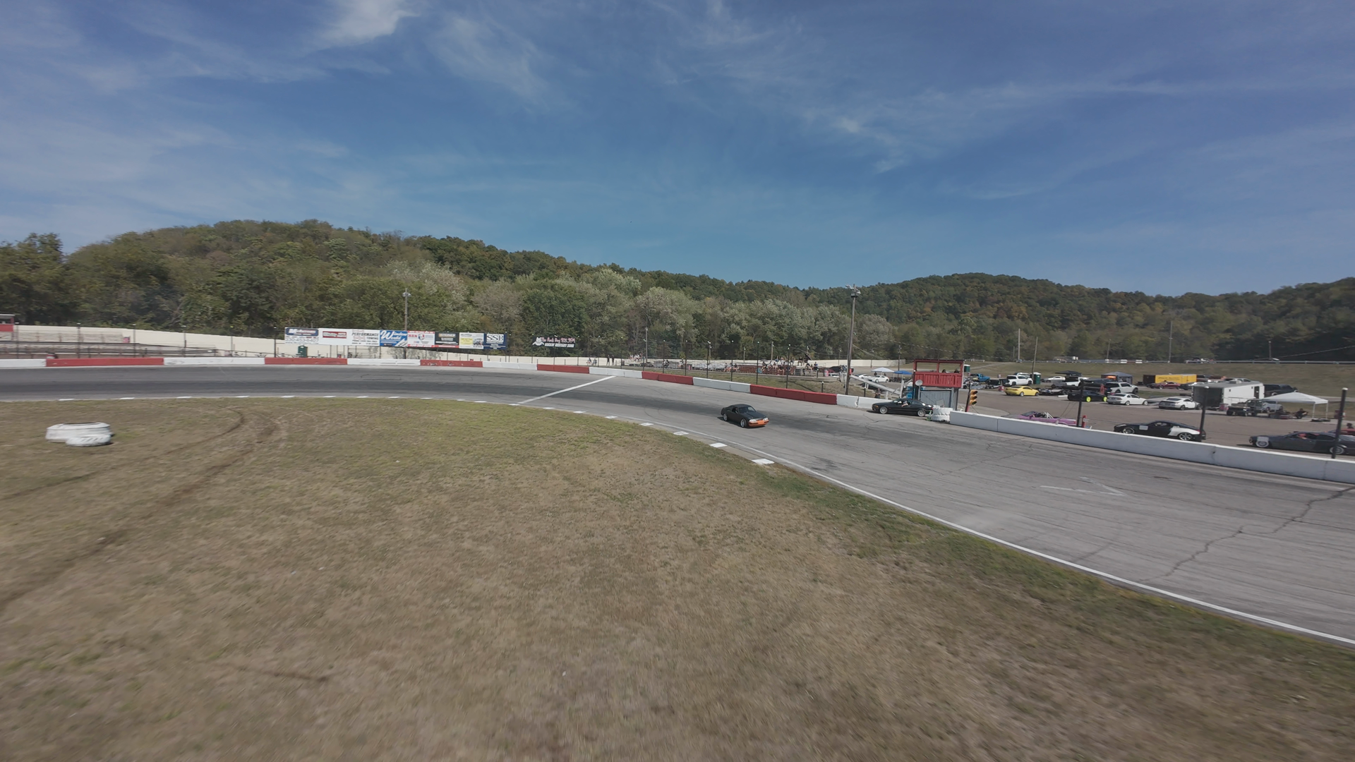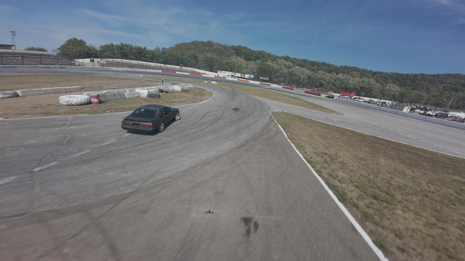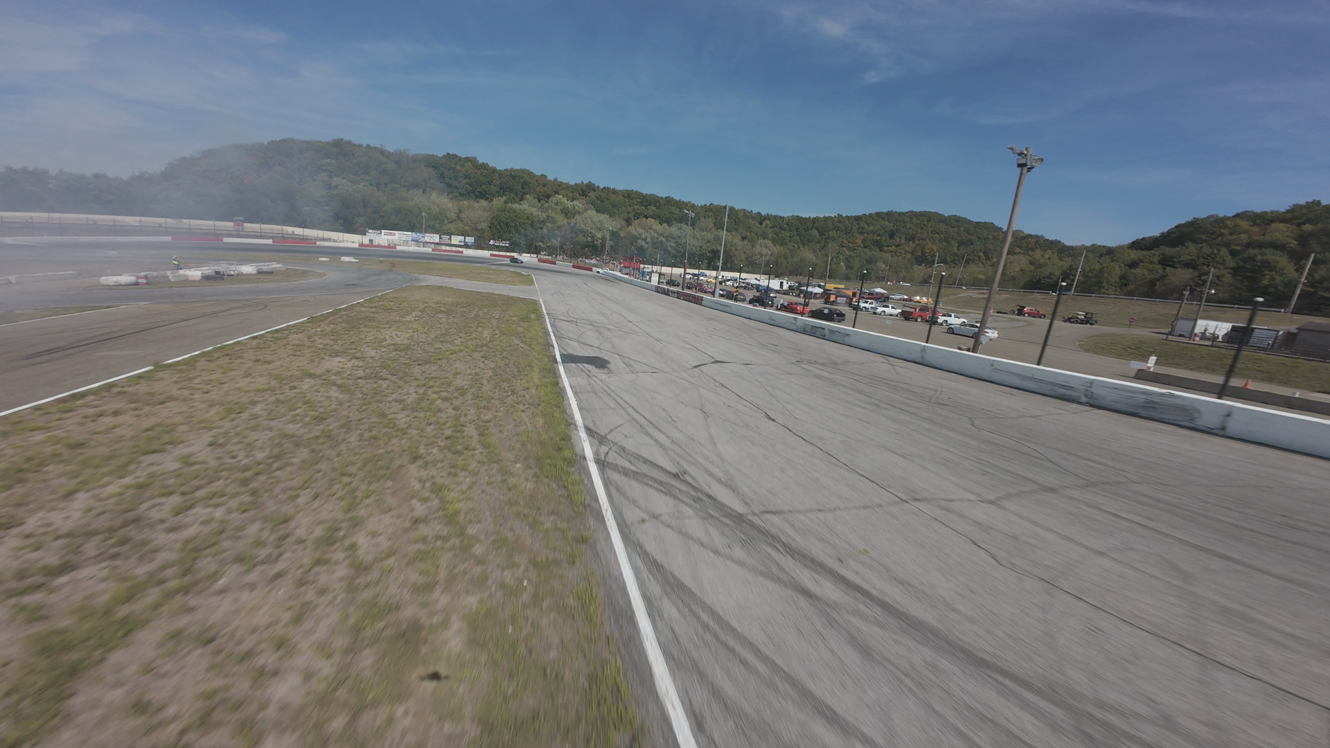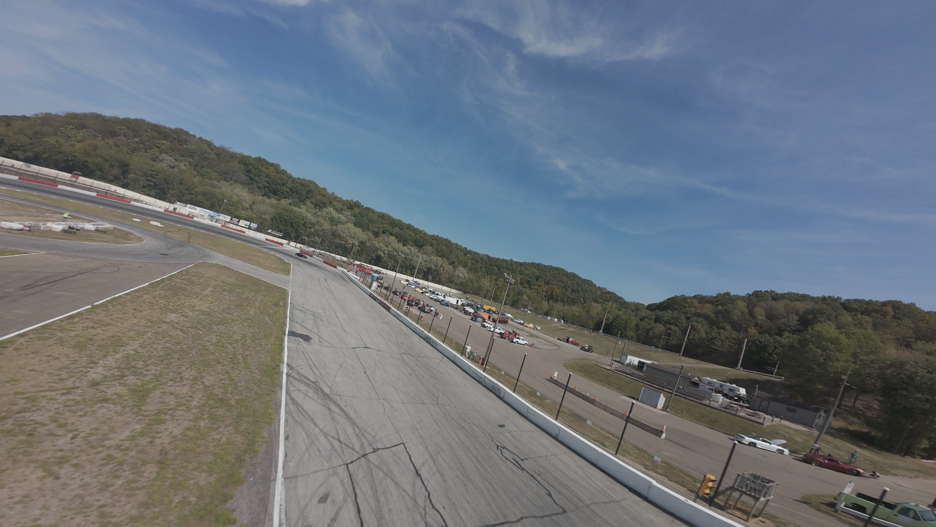 This is an aerial view from a drone at Midvale Speedway, showing a clean, well-maintained track with visible tire marks indicating various racing activities. The track is bordered by a concrete curb and an expansive area of grass off to the side. In the background, a few stationary vehicles and structures are partially visible, emphasizing a quiet moment possibly just before or after an event as gates are either open or about to close. The sky is clear, suggesting favorable weather conditions, with bright sunlight shining over the area, highlighting the texture of the track and the surrounding environment.