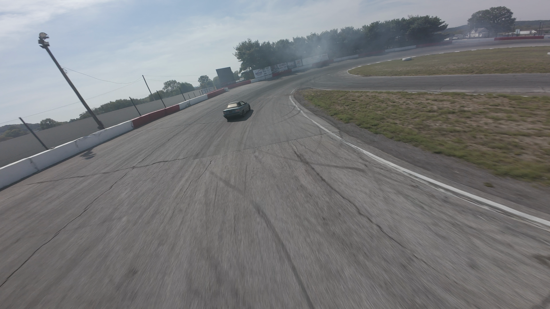 A white sedan is seen drifting along a curved track at Midvale Speedway. The car is positioned in the middle of the turn, indicating mid-drift. The asphalt track features rumble strips and red barriers at the corners, while the surrounding area consists of grass and fencing. The weather is clear with a few scattered clouds, suggesting a daytime event.