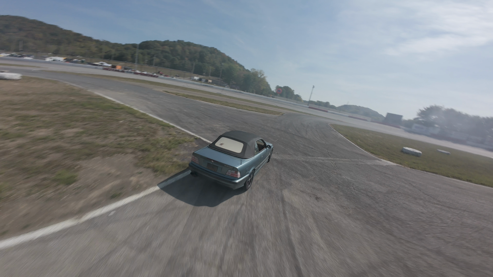 A single blue convertible sports car is captured mid-drift on the sweeping curves of a short track racetrack under clear skies. The vehicle, possibly a BMW 3 Series, wears a standard black top and showcases a well-maintained exterior with no apparent damage. The tires show slight skid marks indicating the car’s movement. The track is marked with white painted lines guiding the course. In the background, a glimpse of other vehicles and structures related to the racetrack can be seen, emphasizing a lively racing environment. The scene is set in the midday, with ample sunlight illuminating the race environment.