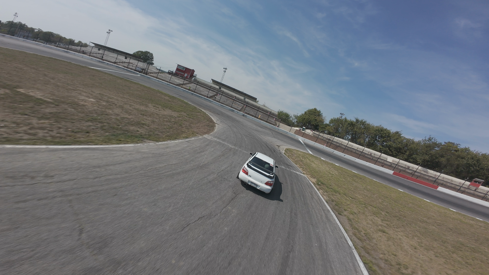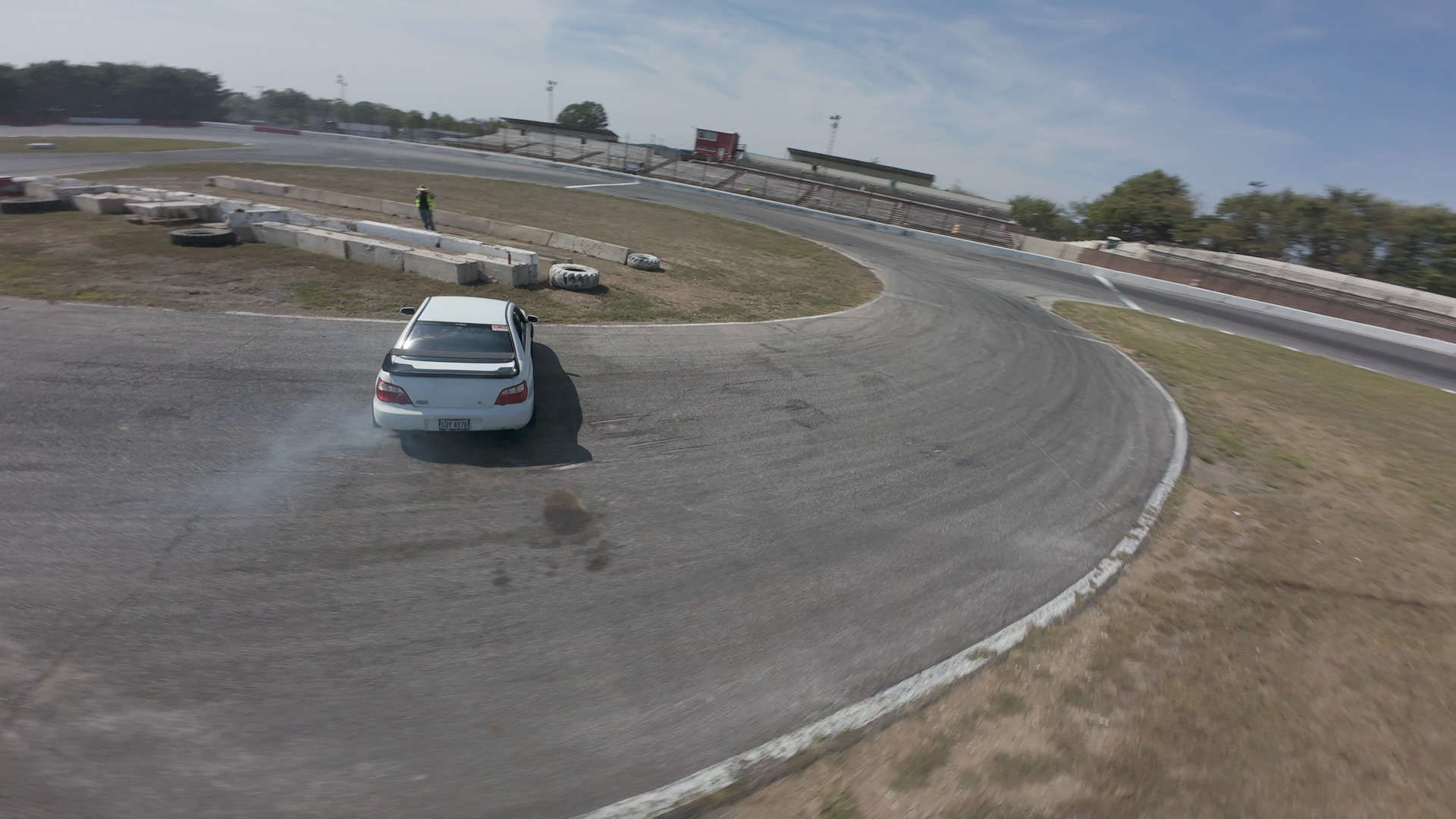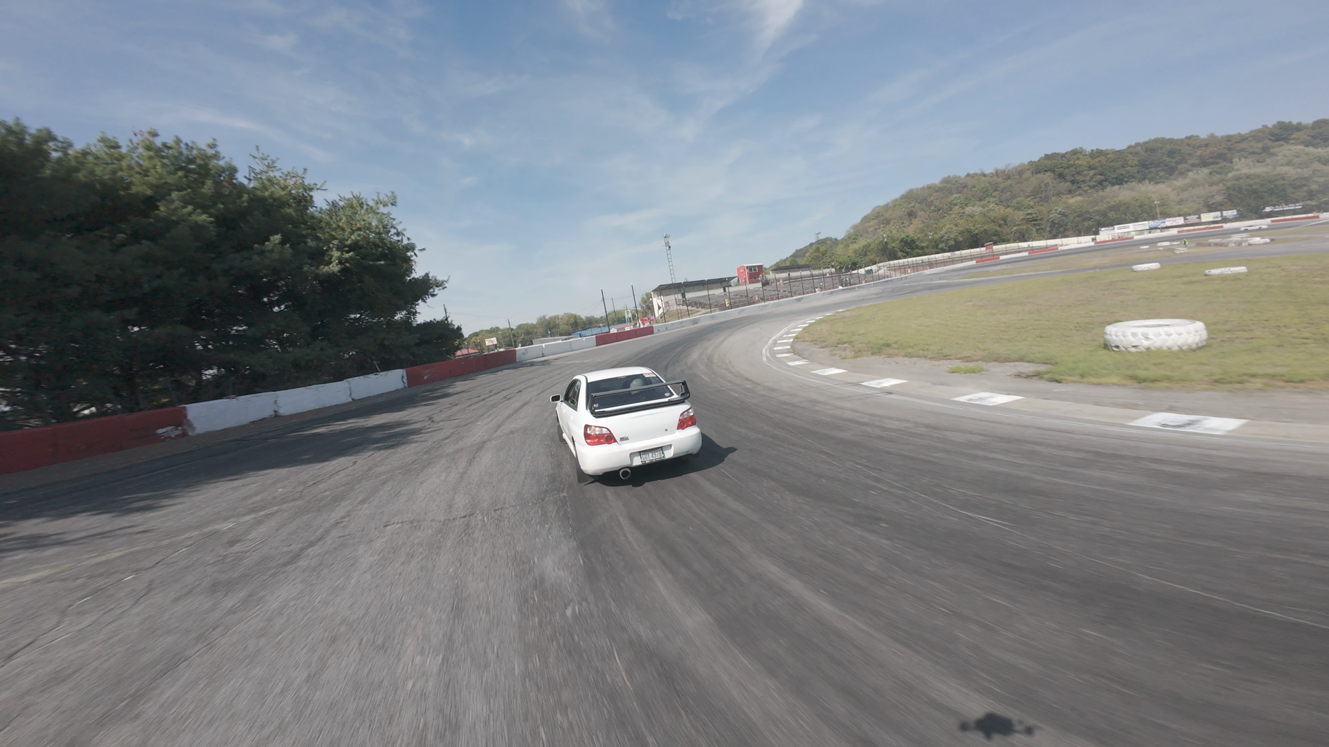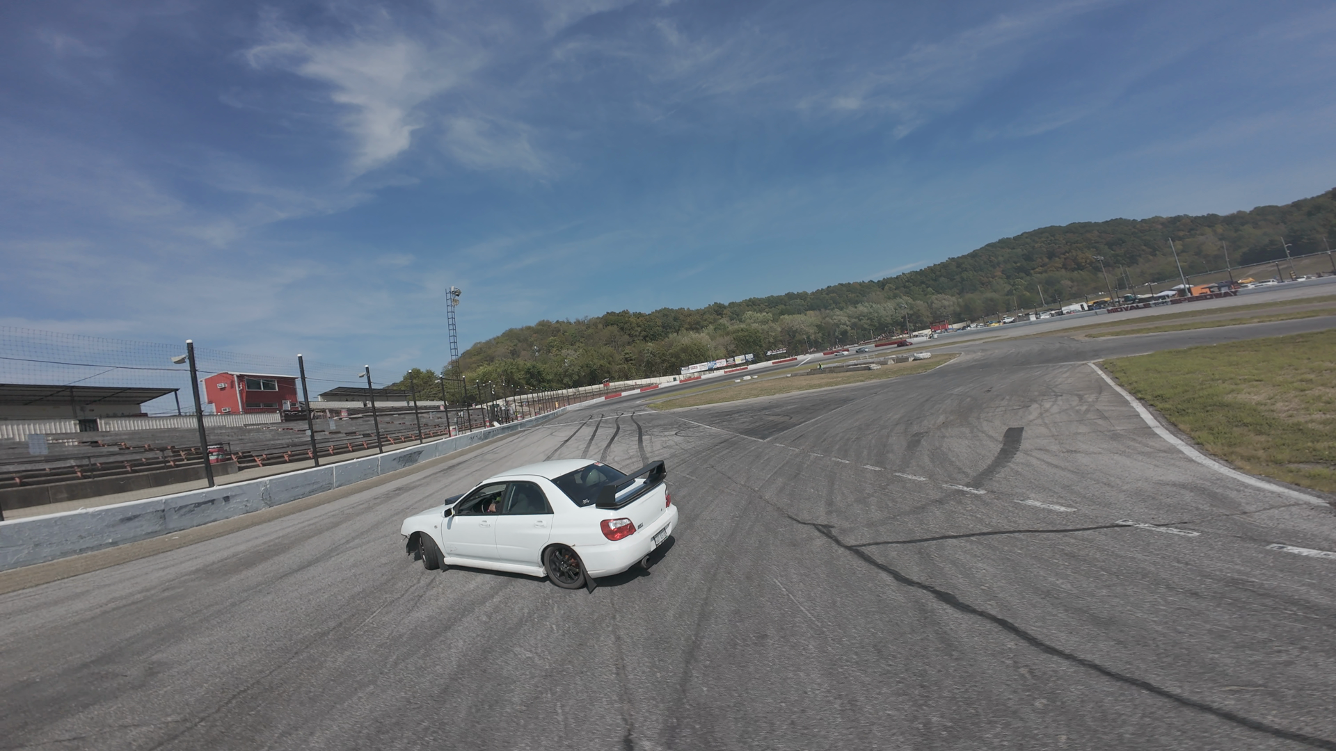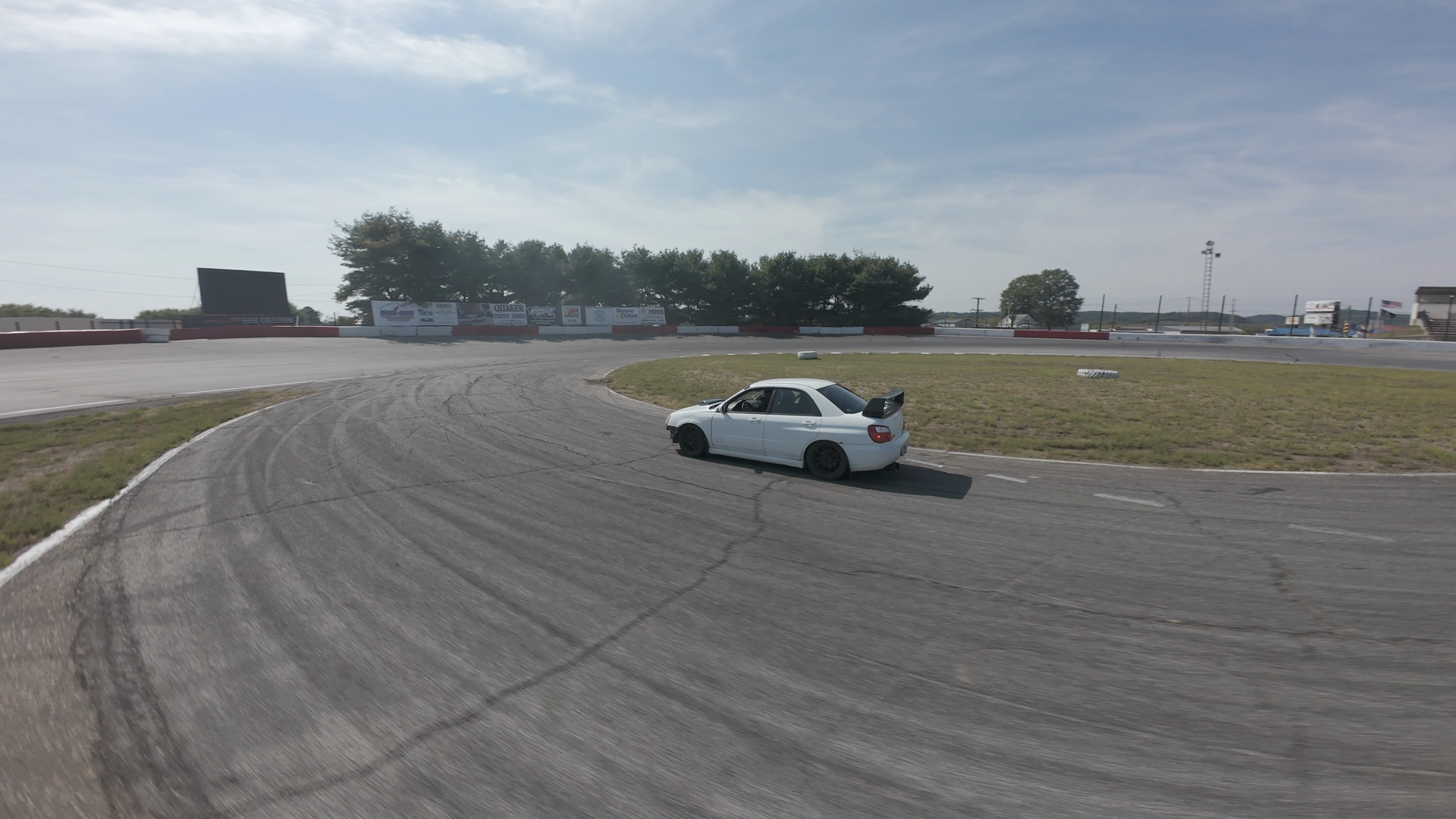 A white Subaru STI is captured drifting on a curved section of a race track. The car is angled significantly to the left of the track's centerline, with its body leaning towards the inner wall. The vehicle appears to be in good condition, indicating no visible damage. The track surface shows signs of use with tire marks, indicating recent activity. The surroundings include a grassy area alongside a curving road, with a clear sky overhead. No people are visible in the image, and the focus is primarily on the car's movement and angle.