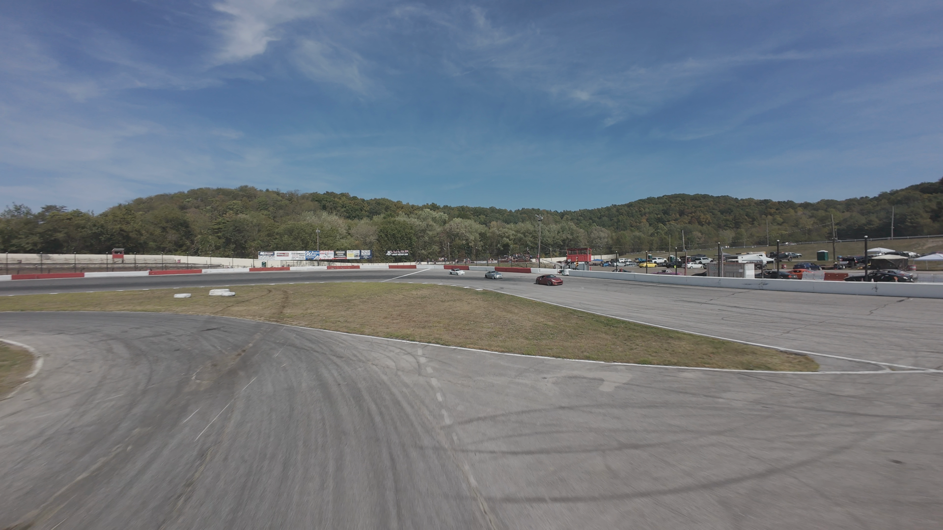 The image shows a wide-angle shot of a racetrack at Midvale Speedway. The track is a well-maintained asphalt oval surrounded by grass and a backdrop of a forested hill. A clear blue sky suggests a sunny day. The track is empty at this moment, focusing on the curve where the road widens before a turn. In the distance, parts of the trackside, including barriers and some structures, are visible. The setting is open-air, with no cars or people visible on the track itself.
