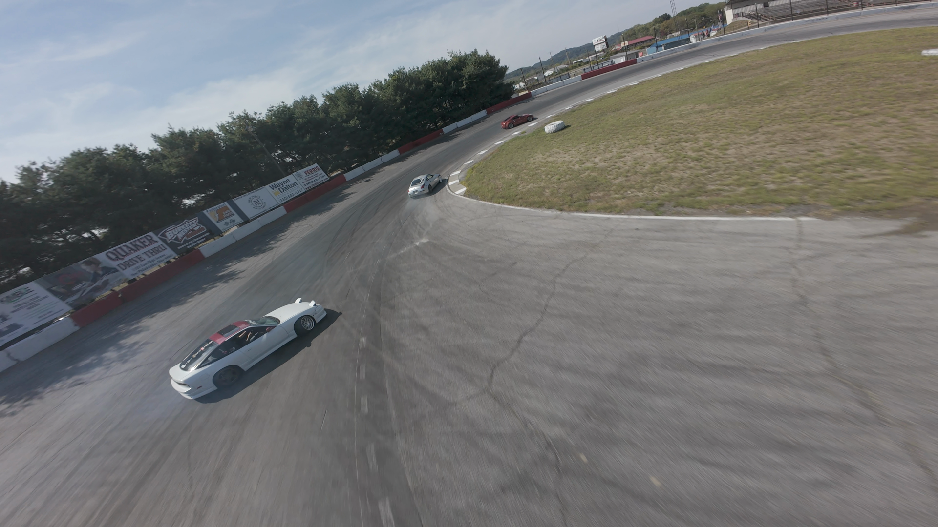 An aerial shot captures a white sports car actively drifting on a paved track, creating tire marks on the surface as it maneuvers through a curve. Another car is visible on the horizon, approaching a section of elevated grassy land. The track is bordered by advertisements and barriers, and the sky is clear with a hint of clouds. The ground shows signs of recent use, with visible tire skid marks. The scene conveys a dynamic and thrilling atmosphere, characteristic of a drifting event.