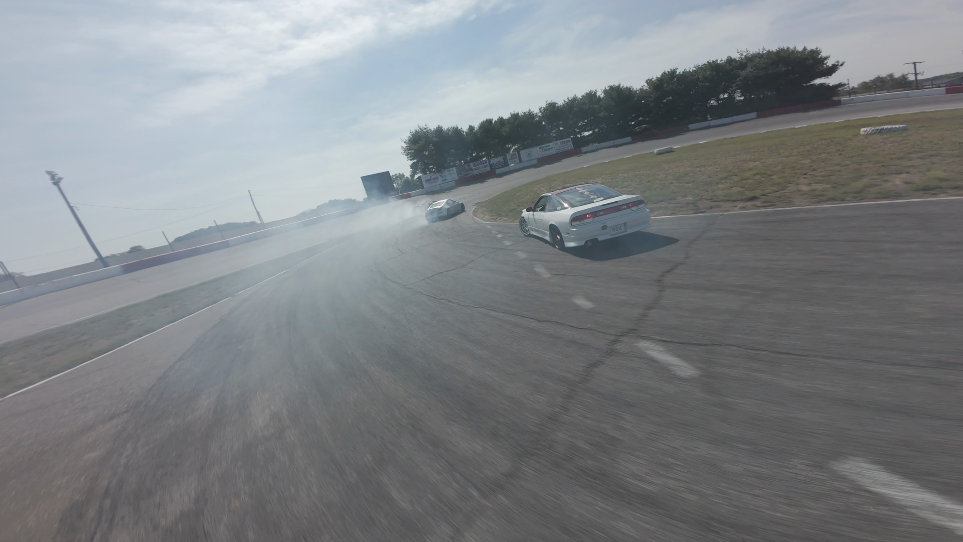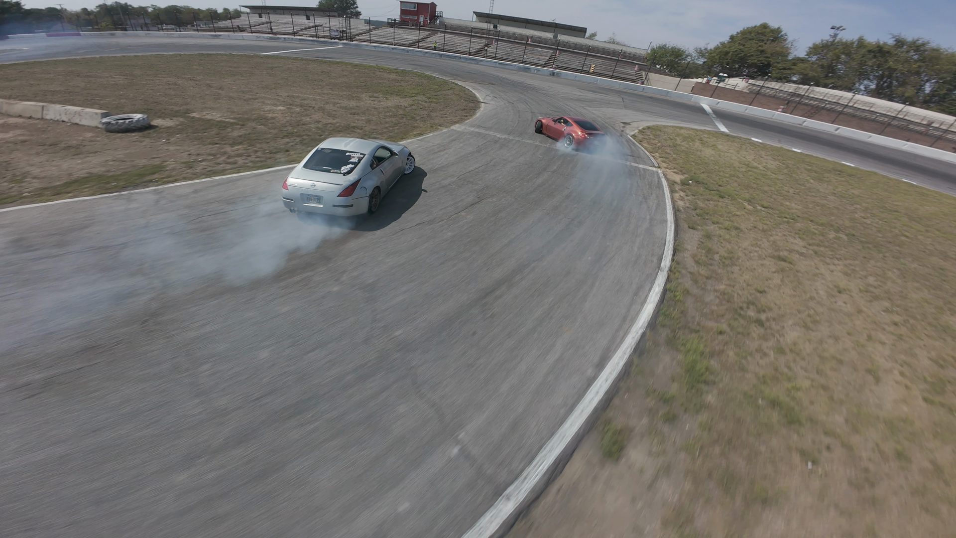 Two race cars are drifting around a curve on a racetrack. The scene shows an aerial view of the vehicles, with one car following closely behind the other, showcasing drifting techniques. Both cars are emitting smoke from their tires as they maneuver through the turn. The background includes the racetrack's surroundings, with grassy areas and safety barriers visible. The vehicles appear to be in controlled motion, illustrating drifting as a competitive sporting event.