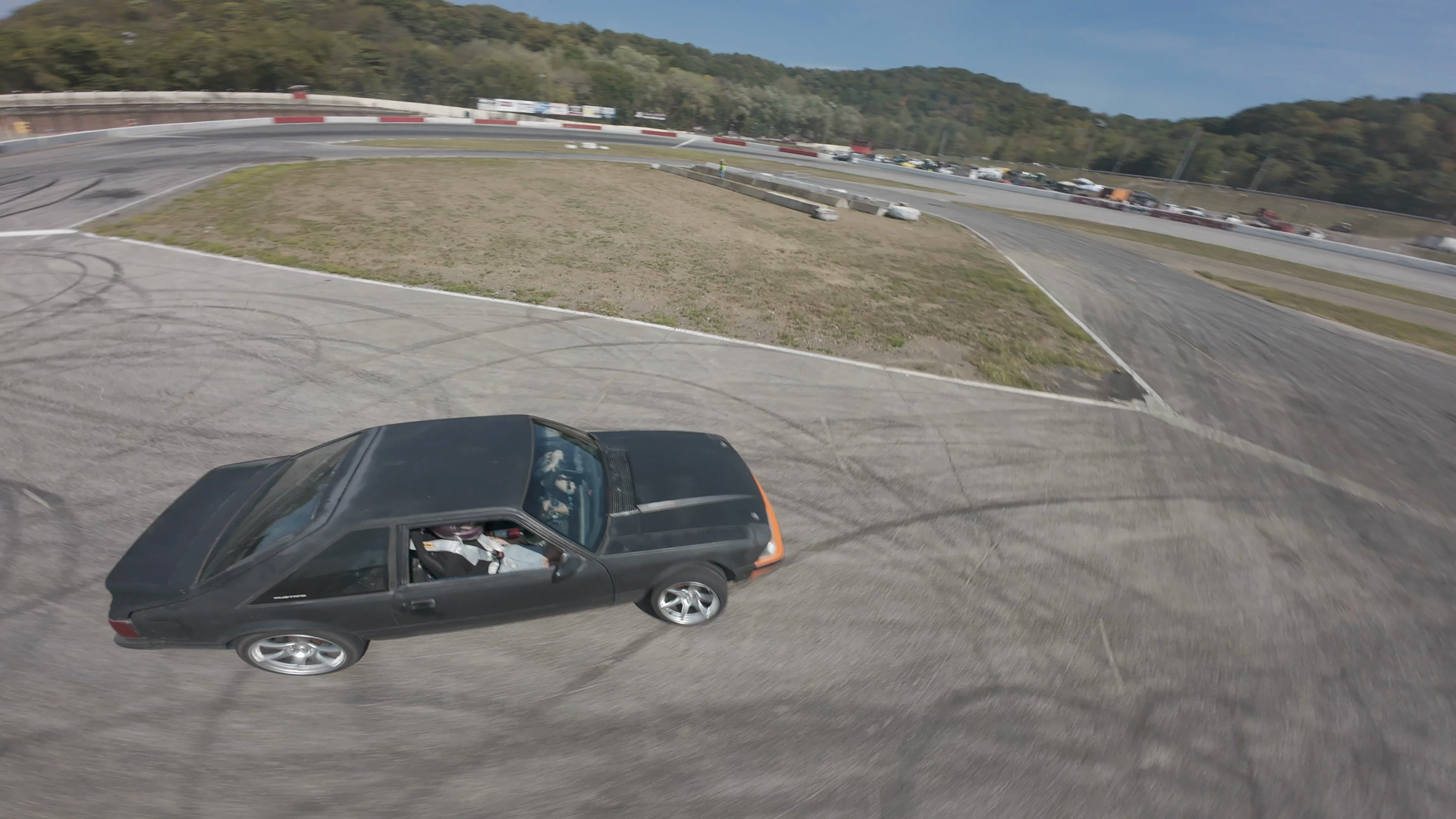 An aerial shot captures a black Ford Mustang drifting on the Midvale Speedway circuit. The car is in the middle of a drift, leaning slightly to the right as it navigates a turn. The driver, wearing a white helmet and a racing suit, is focused on maintaining control of the vehicle with both hands on the steering wheel. Tire marks are visible on the asphalt, marking the vehicle's path through the curve. The track is surrounded by sparse grass and a few scattered trees, with a few spectators and parked vehicles in the background indicating the event's setting and scale.