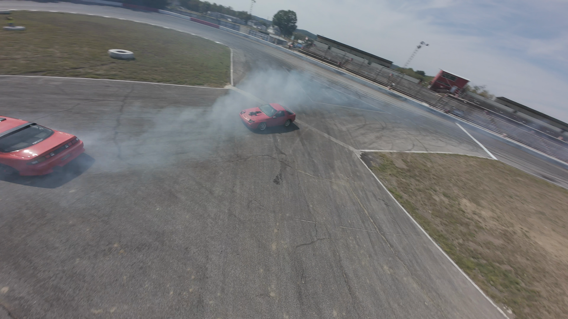 An aerial view captures a scene of two red cars drifting on a narrow asphalt track at Midvale Speedway. The car in the foreground is executing a drift through a series of loops, emitting plumes of smoke from its tires. The track is bordered by grass and a simple fence in the background, with a small spectator stand on the right side partially visible. The event is likely part of the Club Loose Drift event, which focuses on recreational drifting in a controlled environment. The excitement score is 3.0, indicating a moderately exciting scene.