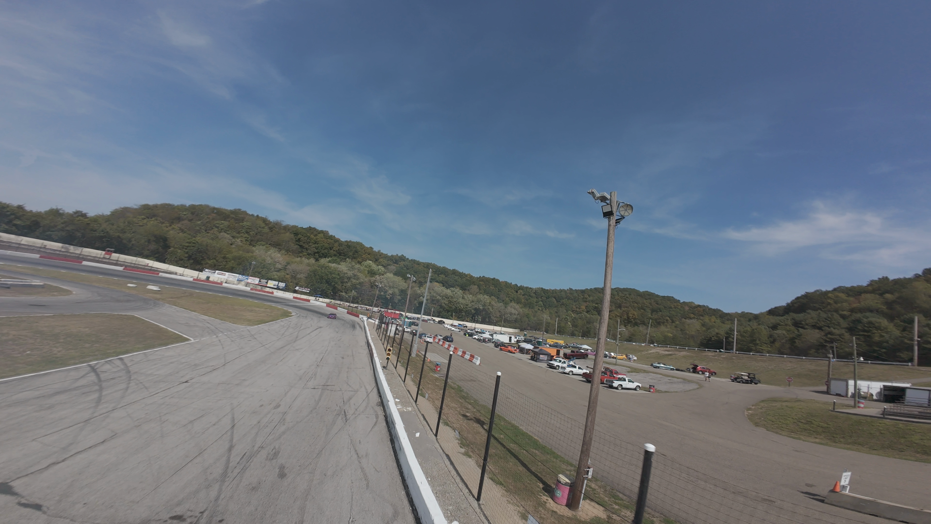 The image shows an expansive view of Midvale Speedway under a clear blue sky. A single, curved track stretches into the distance, bordered by protective barriers and fencing. On the right side, several vehicles and trailers are parked in the infield, indicating preparation for a racing event or an ongoing drift session. The backdrop features dense, green forested hills, adding a natural contrast to the racetrack environment. The absence of active cars on the track suggests a lull in the event or preparation phase.