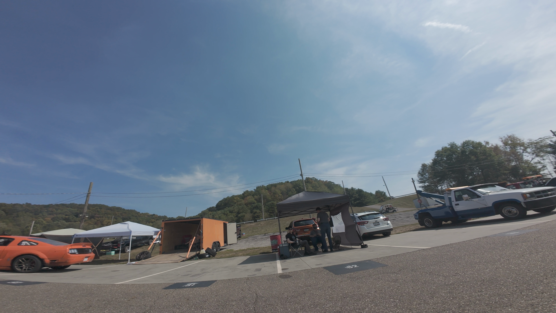 The image depicts the entrance area of Midvale Speedway under a clear blue sky. Several white tents are set up, accommodating possibly event staff or visitors. Parked vehicles, including a tow truck and a white sedan, are positioned on the grounds, suggesting preparation for an event. People are casually gathered around the cars and tents, possibly discussing logistics or waiting to enter the track. The surrounding area features green trees and open grassy spaces, indicating a rural or semi-rural setting. The scene is calm with no active drift or race occurring, as the drift competition has not yet commenced.