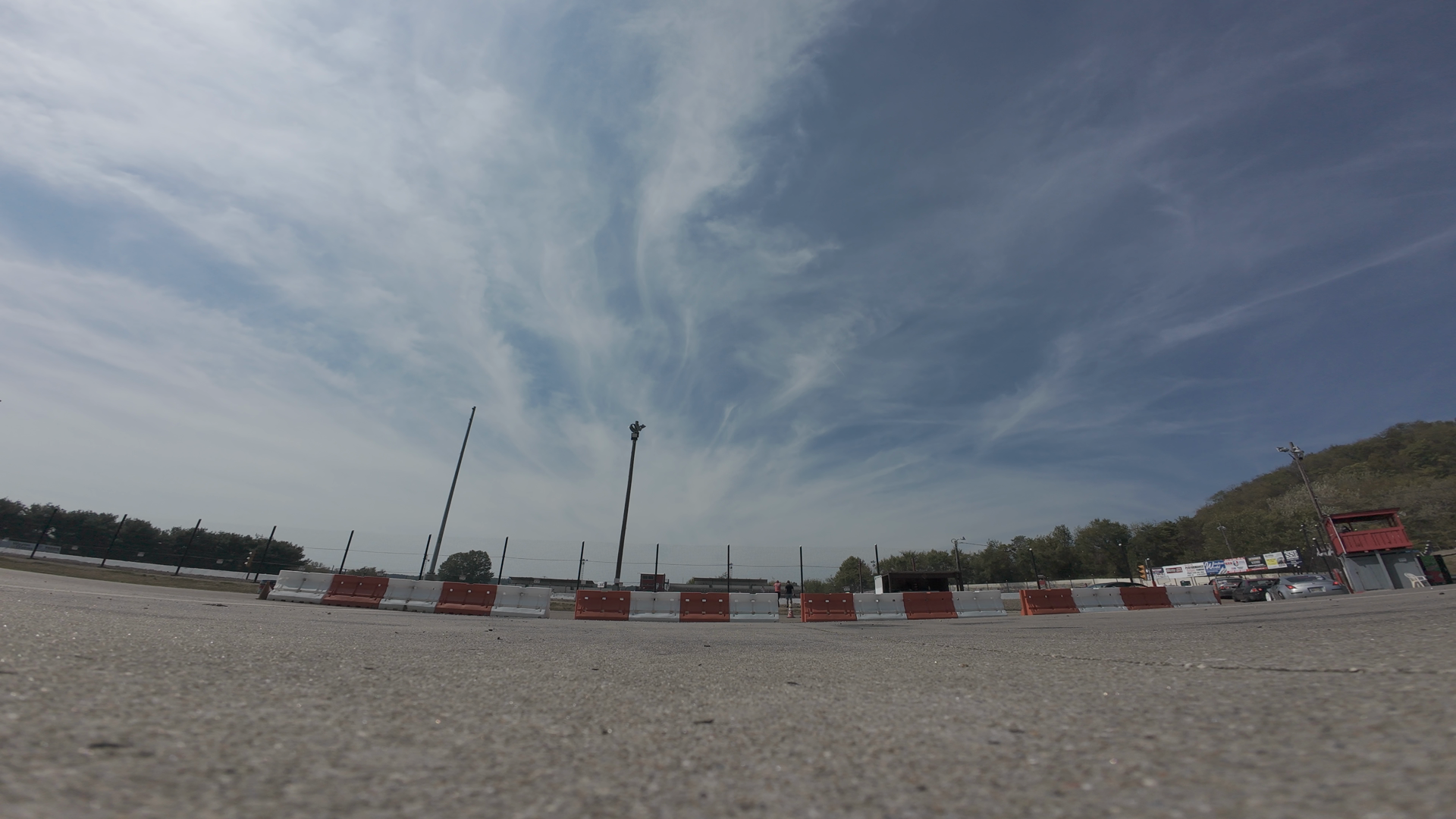 The image shows an expansive flat asphalt surface, forming the main race track at Midvale Speedway. The track is bordered by safety barriers and lampposts in the middle distance, with sparse signage visible. Overhead, the sky is partly cloudy with patches of blue, suggesting a likely mild or cool day for an outdoor automotive event. The absence of cars or people gives the scene a quiet, calm tone, characteristic of the early hours after an event has ended or before it starts. In the far background, structures like a small building with a red roof are visible, possibly the ticket booth or visitor center. The overall atmosphere conveys a sense of anticipation or abandonment depending on the timing during the day.