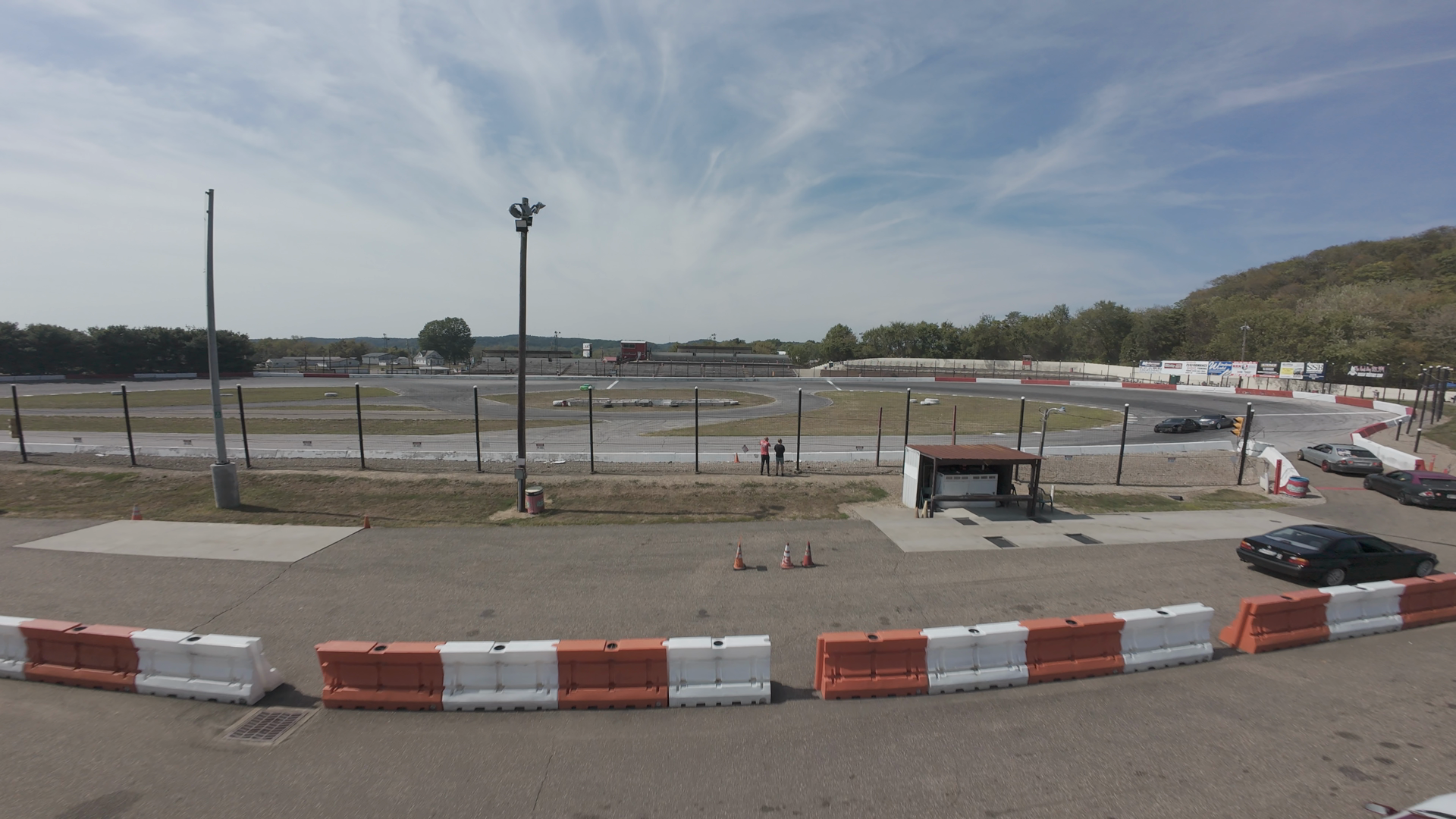 An expansive view of Midvale Speedway under construction or maintenance. Safety barriers are visible in the foreground, with orange and white blocks creating a clear pathway across the course. In the distance, an empty racing track is surrounded by various equipment, trailers, and temporary structures. Two individuals can be seen near the center, likely workers or event organizers, attending to the venue. The sky is clear with scattered clouds, indicating daytime with good weather. The scene reflects preparation or reset activities for the Club Loose Drift event scheduled for the location.