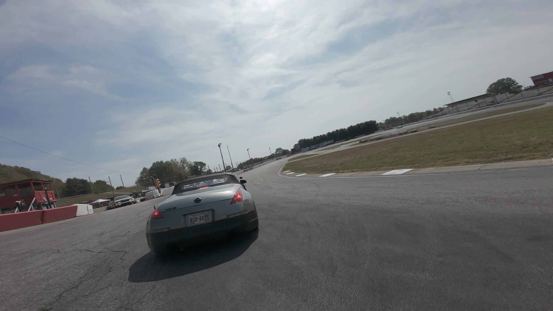 The image captures a gray Nissan 350Z driving on a paved racing surface at Midvale Speedway. The car is centered in the frame, with its rear view displaying prominent tail lights and a sporty rear spoiler. The license plate reads 'KIP-4035'. The surrounding area includes the track's tarmac, sparse trees, and some spectator areas with small buildings and fences. The sky is clear with scattered clouds, suggesting good weather conditions during the drive. The car appears to be stationary, possibly at an event's break or an unoccupied moment in the session. The excitement level is moderate, with no visible tire smoke or drift action occurring in the image.