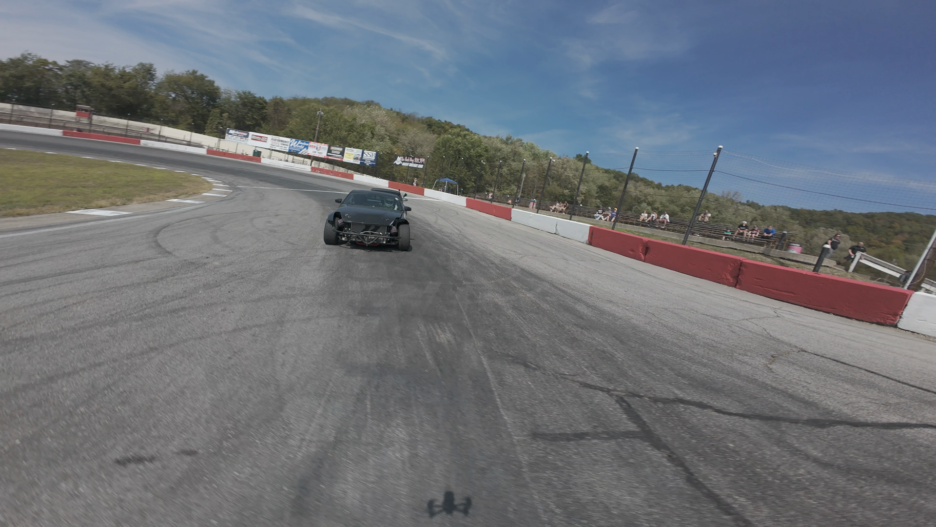 A black race car is drifting on the Midvale Speedway track, navigating a curved section of the track near a red and white barrier. The car appears to be in motion, leaning into the curve with visible tire marks on the asphalt. The sky is clear with a few high clouds, indicating a sunny day. In the background, a few spectators can be seen sitting on wooden bleachers observing the event. The scene captures the excitement of a drifting session on a purpose-built race track.