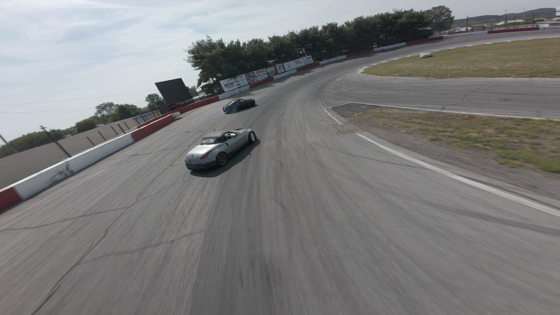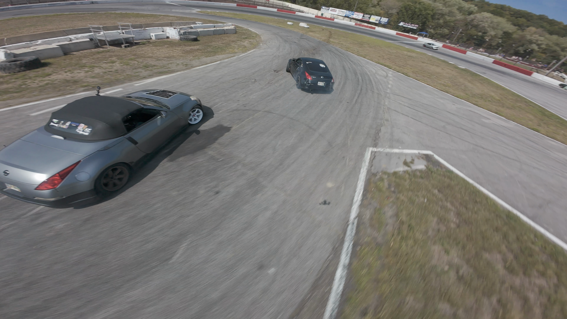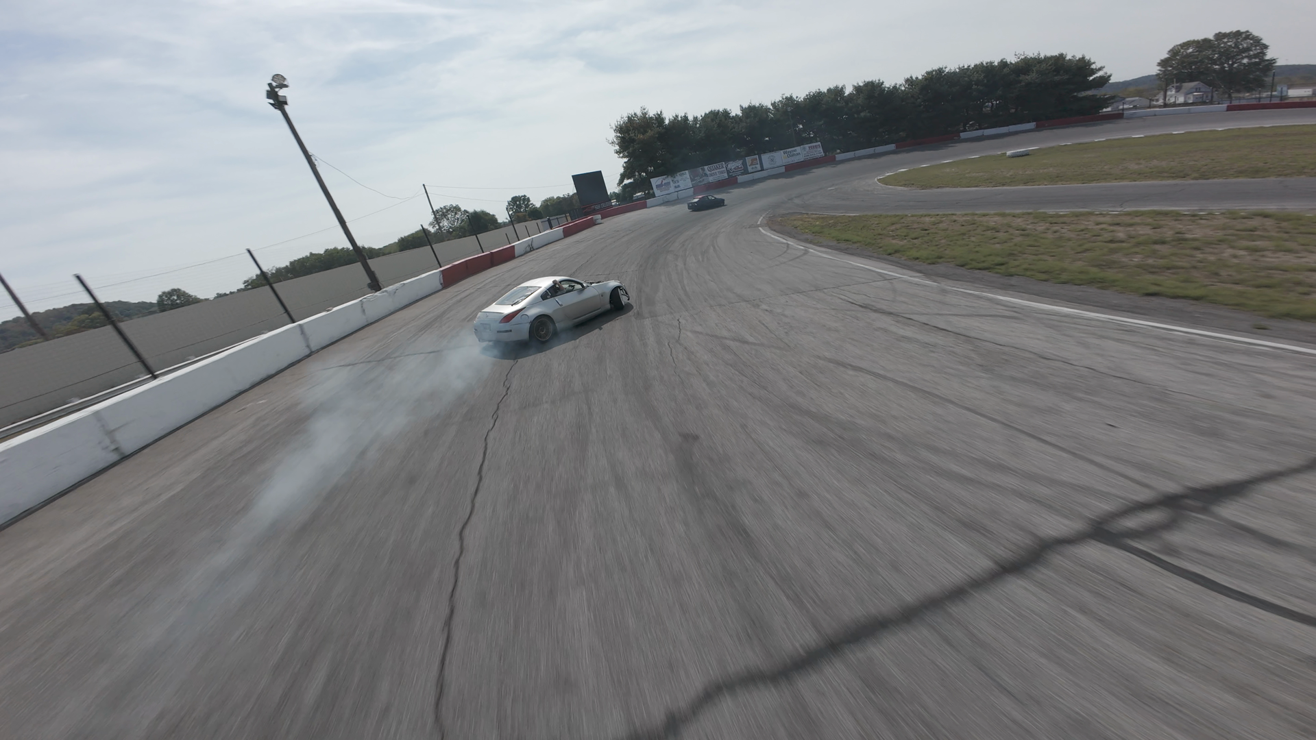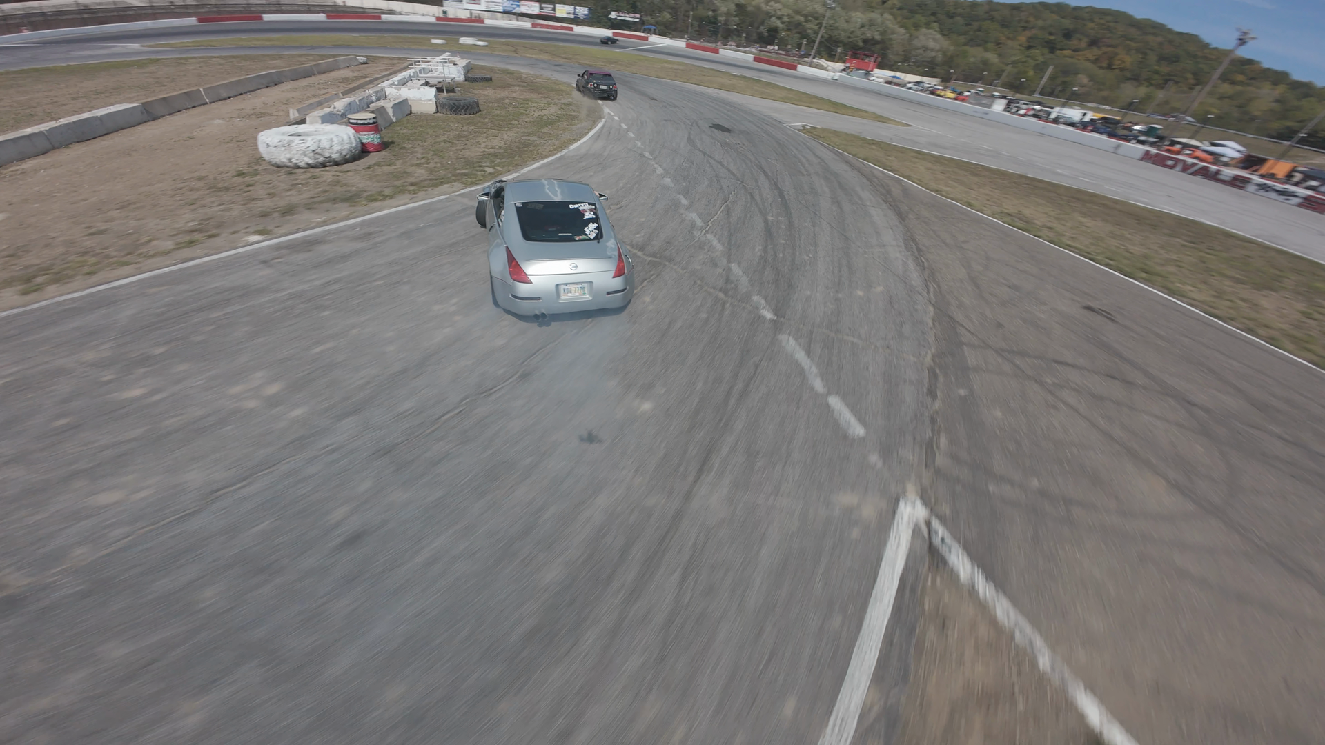 The image shows a silver Nissan Fairlady Z drifting through a turn on Midvale Speedway. The car is leaning into the corner, producing a cloud of smoke from its tires. The scene is viewed from a high-altitude perspective, likely from a drone, providing a clear view of the car's path and the well-maintained asphalt track. The edges of the turn are bordered by red and white curbing, and the background features advertising boards along the track's barriers. The car appears in excellent condition, with no visible signs of wear other than the tires being slightly worn due to use. The overall atmosphere suggests a competitive or practice session, with the track conditions indicative of regular vehicle use.