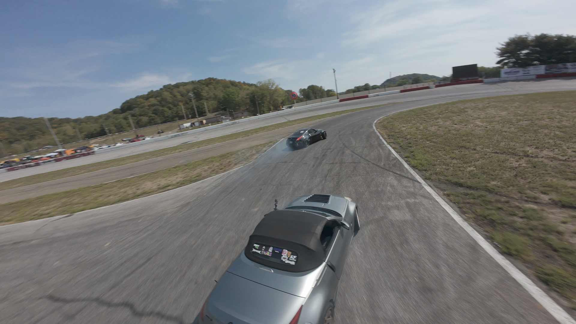 The image shows a wide-angle view of Midvale Speedway, a short track known for its family-friendly atmosphere and fast racing. The track features asphalt with white stripes marking the edges, surrounded by patches of grass and trees under a clear blue sky. The background includes a hill with dense foliage and some small structures, likely rest areas or viewing platforms, along with event signage in the distance. The scene suggests the track is not currently in use for racing or drift events, as there are no visible cars or drivers on the track.
