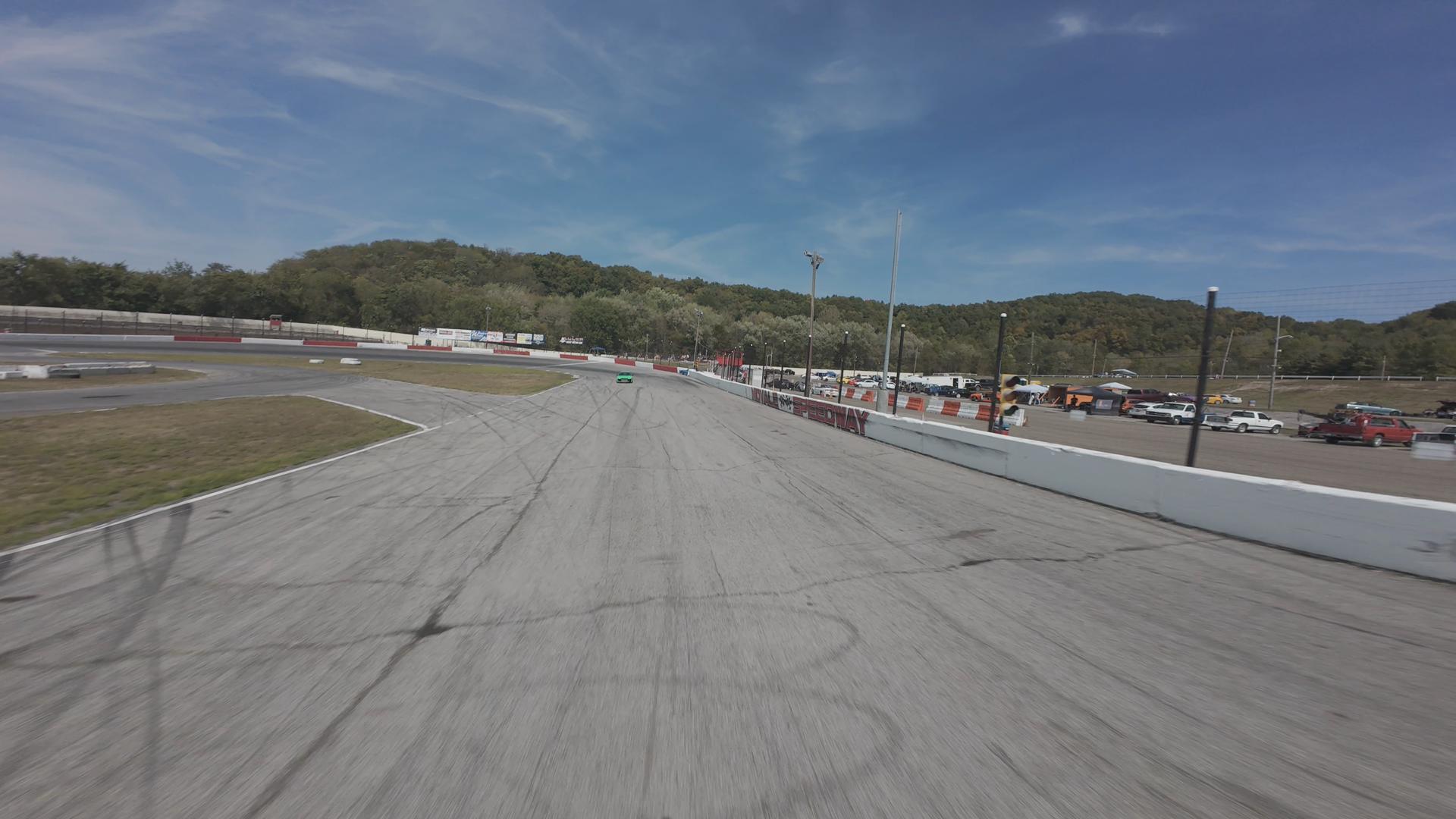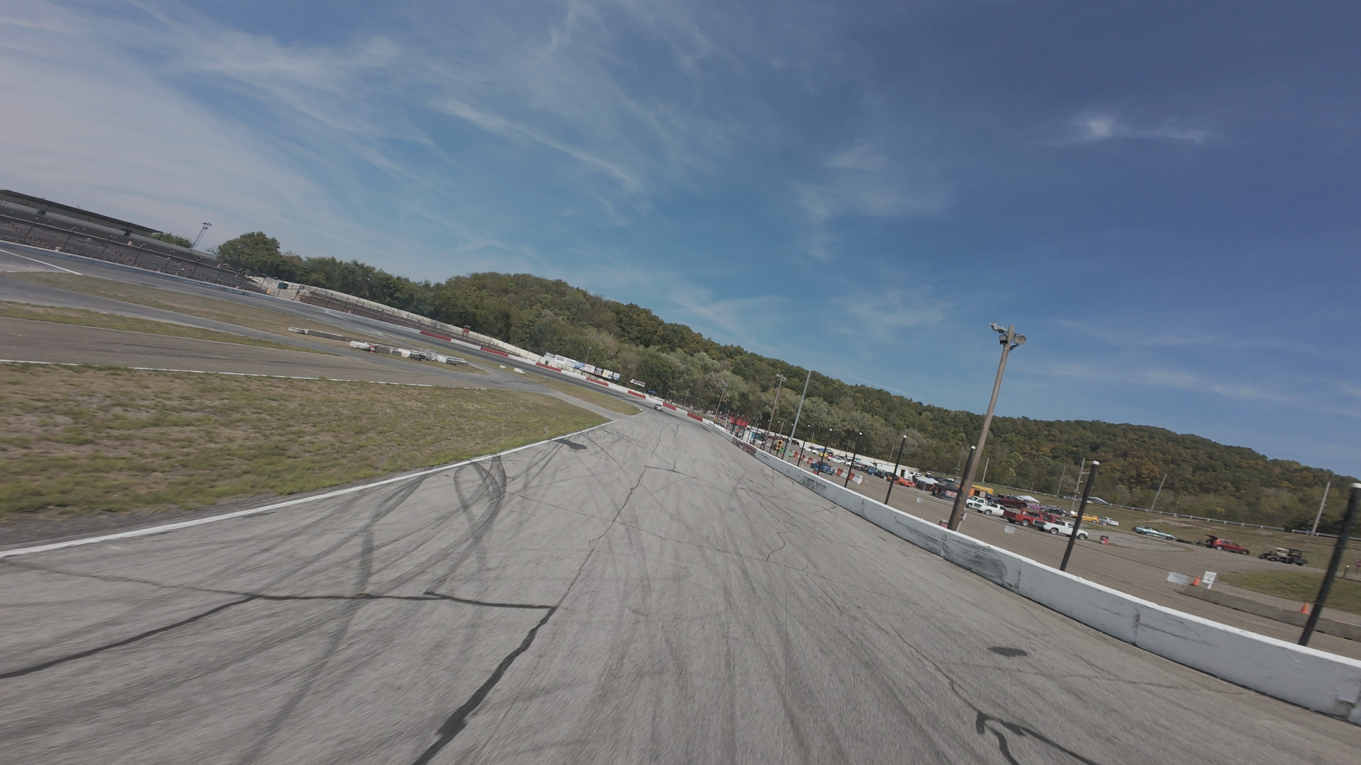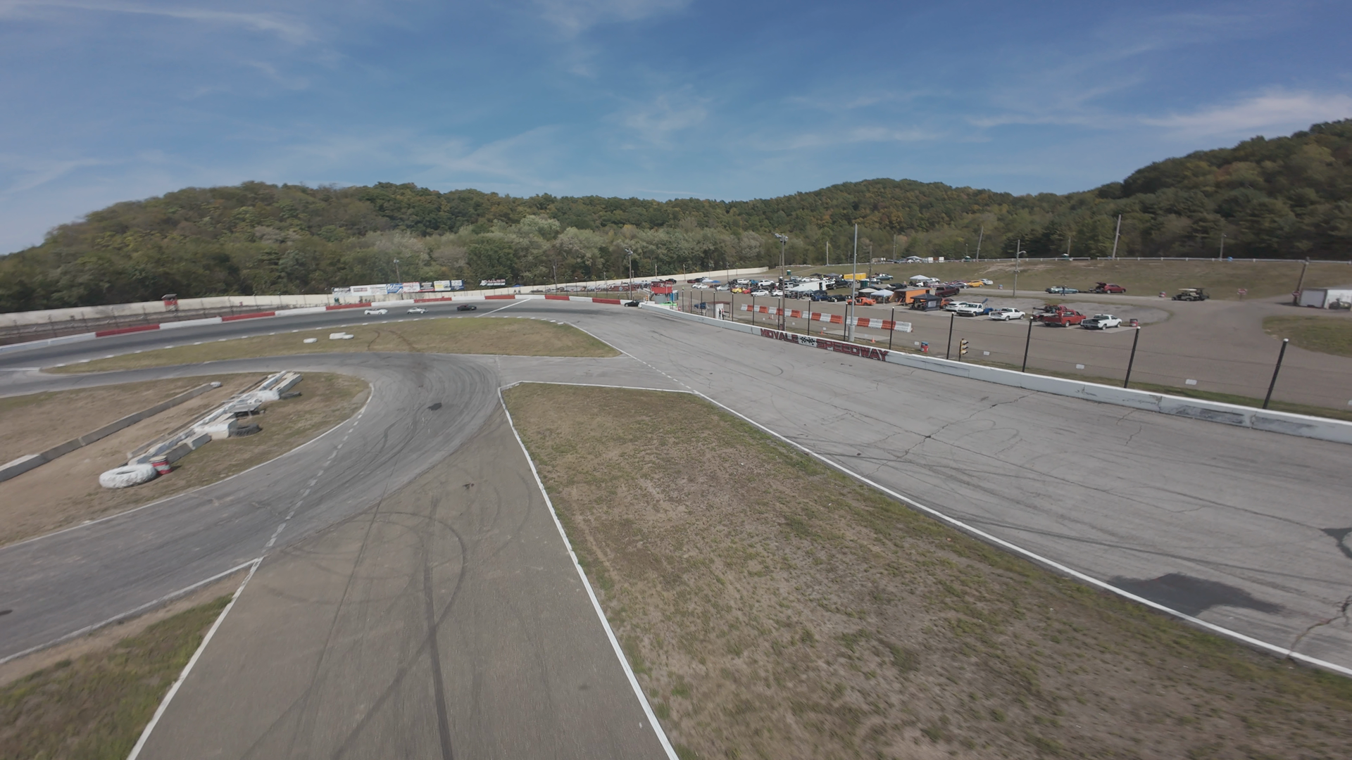The image shows a wide view of midvale Speedway under a clear blue sky. The track stretches out, with visible tire marks indicating recent racing activity. On the right side, there are parked cars and maintenance vehicles near the track's edge, with some debris scattered along the area. The background features a line of trees and a road intersecting the track. The environment is calm, with no vehicles or people in active motion within the frame.