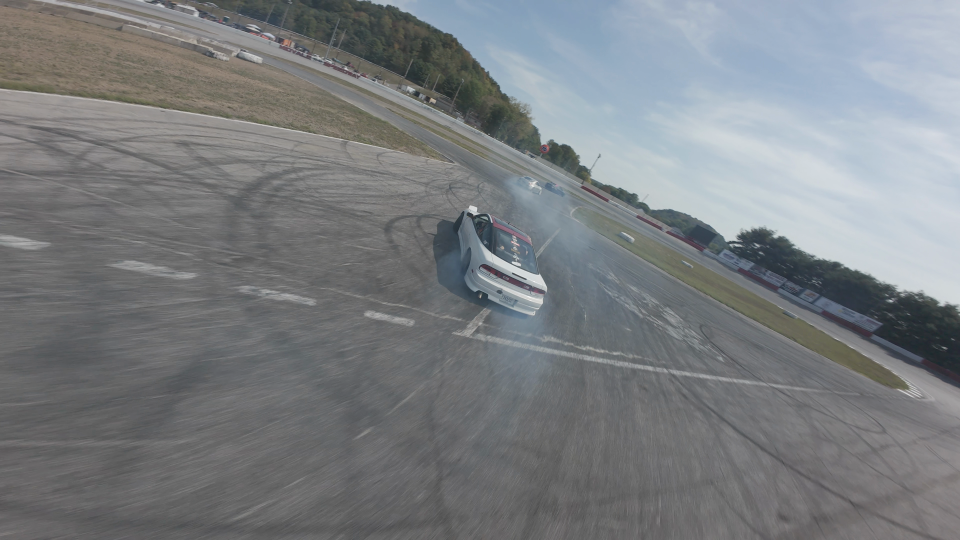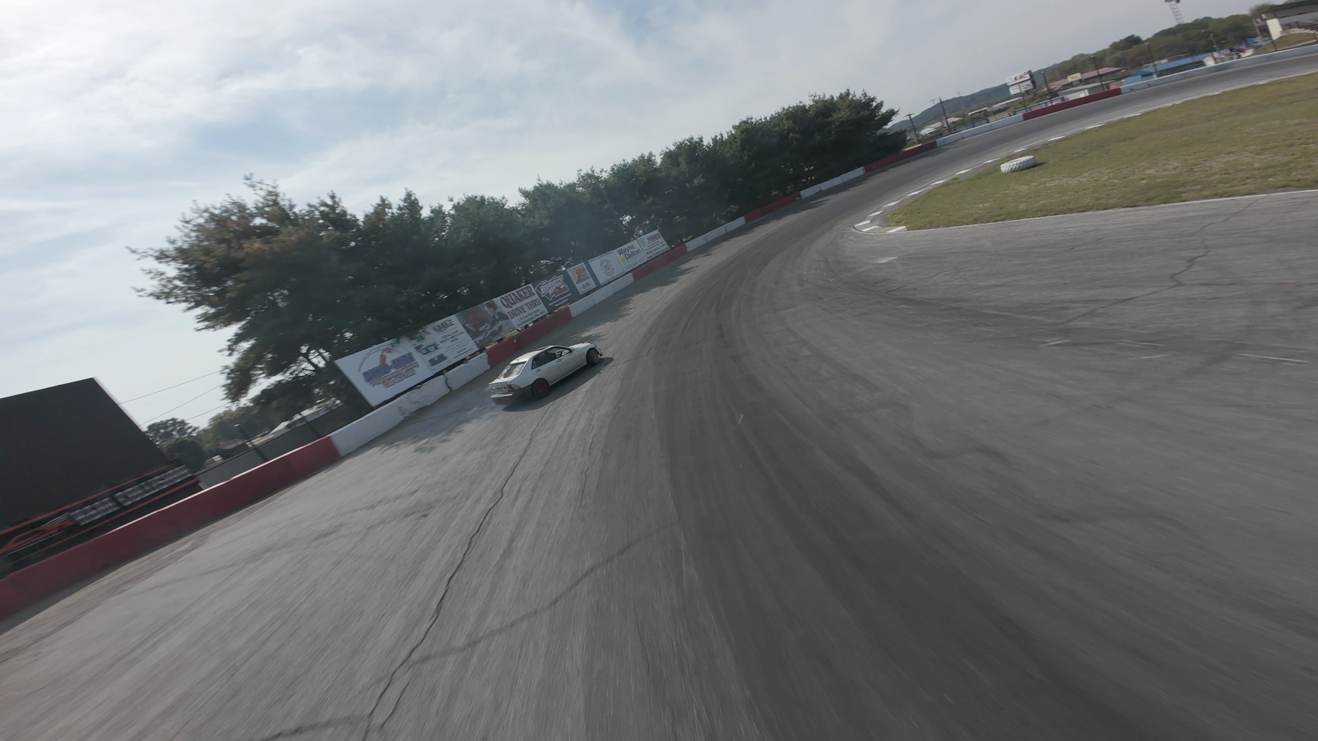 A white car is drifting around a turn on the asphalt track at Midvale Speedway. The car is generating tire smoke as it leans into the drift. The race car driver, visible through the roll cage, appears focused. The scene captures the dynamic motion of the wheelie with a curved road and tire marks on the asphalt. The sky is partly cloudy, and the surroundings show the vast expanse of the race track with trees and fencing on the perimeter. The excitement level is high, indicated by the smoke and the driver's intense focus. The car is positioned mid-drift, demonstrating advanced drifting techniques.